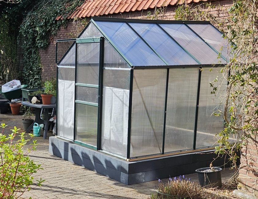 Geplaatst: 1 april 20251 Apr Kas is bijna klaar! Heb uiteindelijk net iets meer dan een stilstaande brommer ervoor ingeruild... Op het spit in de rug na, heerlijk. Heb hier zo'n tijd over gepeinsd.. Latjes gaan nog vervangen worden door hardhout, maar de kas staat met spanwartels en ringen vast genoeg voor het moment..