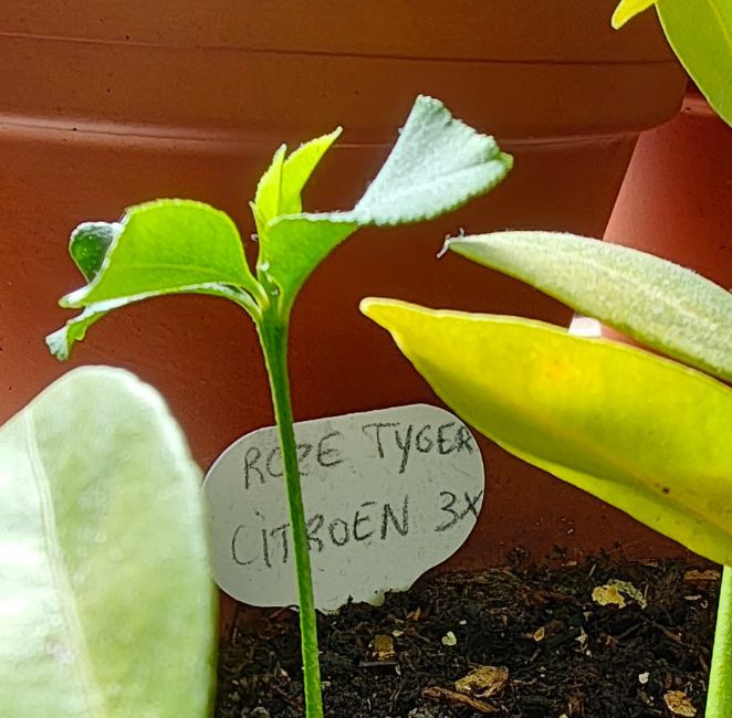 Geplaatst: 7 april 20257 Apr Kijk nou, kleine bloemknopjes in de vingerlimoen (citrus australasica) 🤗 en toch nog een zaailing van de roze tijgercitroen, jubel de jubel 🤸 Mulch! Moeder natuur houdt niet van kale grond.