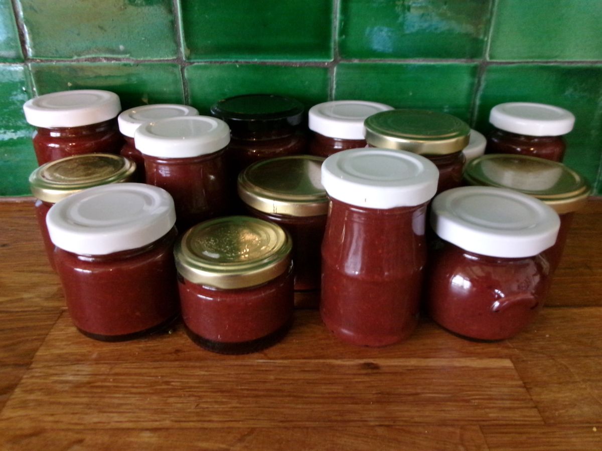 De wijnbessen van gisteren tot precies 1 potje saus vermaakt.