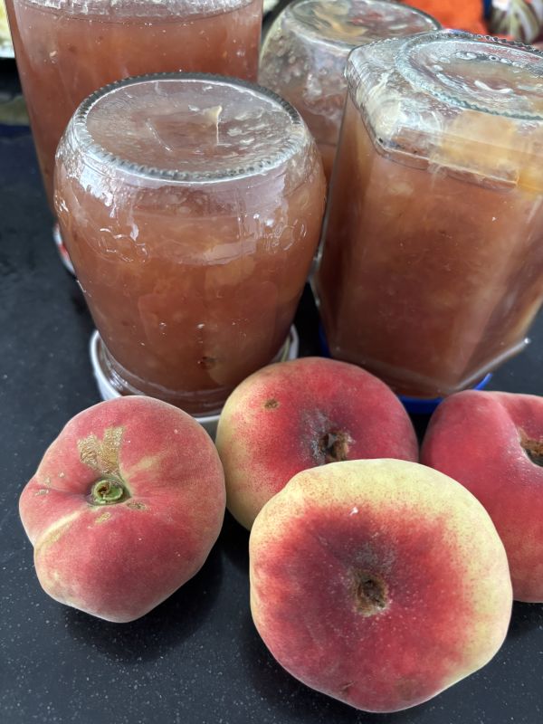 Ik heb de perziken van gisteren tot Jane gemaakt. Rook heerlijk. Was even naar de kippen toe om restje te geven. Toen zag ik een rijpe vijg. Moest ik weer in de steiger klimmen. Zag ik nog een rijpe vijg. Kan niet met 2 vijgen huis in gaan zonder ze af te staan. Moest ze dus eerst opeten -wat een straf-