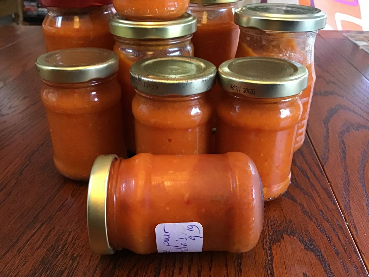 Geplaatst: 9 oktober 20205 j De aangepaste tomatenchutney gemaakt, als tortillasaus. Met de laatste buitentomaten. Iets teveel suiker gebruikt, even niet nagedacht, de vorige keer kas ik kokosbloesemsuiker dat geeft een mindere zoet. Lie vind het heerlijk trouwens. Ik was aan t laatste potje van vorig jaar bezig dat heb ik bijgevuld met het laatste uit de pan, je ziet wel dat er dit jaar meer gele tomaten over waren, de onderste helft is roder. Lie vind het heerlijk, ik heb het alleen warm geproefd en vanavond proeven met wat maischips.. We zijn allemaal kinderen van de Aarde 🌎