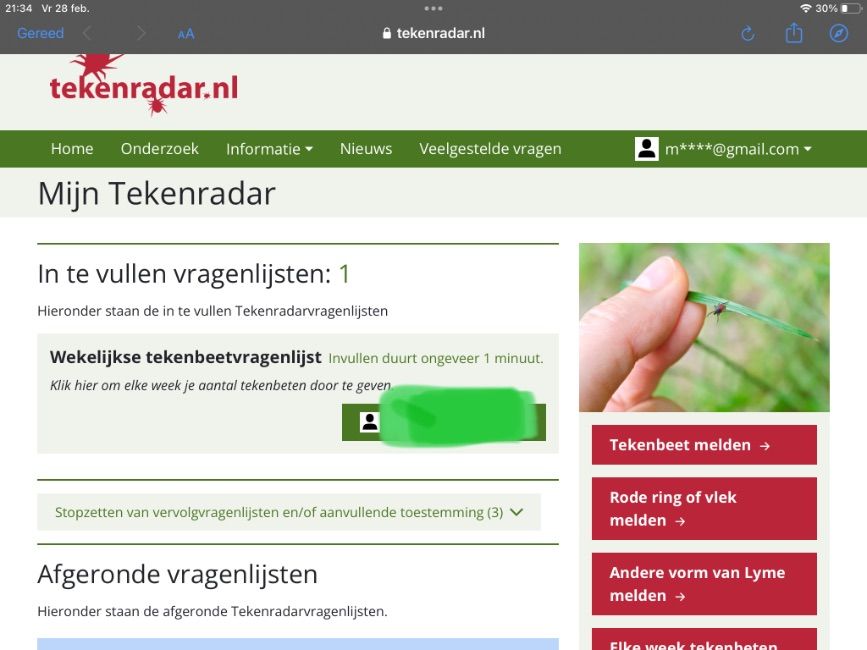 Geplaatst: 28 februari 20251 j Gisterenavond dus die teek waar we het in een ander topic al over hadden op/in mijn bovenarm gevonden. Ze zijn dus al actief, een gewaarschuwd mens telt voor twee. Op de teken radar die ik iedere week invul zie je op de homepagina ook de hoeveelheid tekenbeten die gemeld zijn de afgelopen week en hoeveel besmettingen van Lyme er zijn gemeld met een erythema migrans ( rode vlek) als signaal. Ook andere door teken overgebrachte ziektes worden daar bijgehouden en je vind er het laatste nieuws. En tips Best goed om mee te doen. We zijn allemaal kinderen van de Aarde 🌎