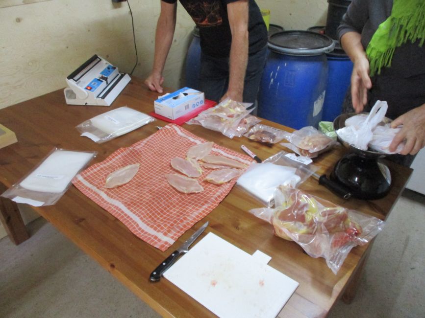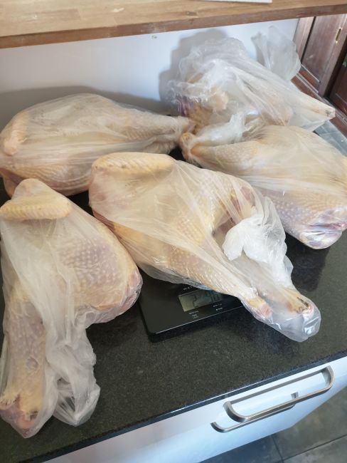 Geplaatst: 20 september 20205 j Auteur Heerlijk! Was dat nou die wat zwaardere hen? Of hadden we die vacuüm verpakt voor de vriezer? Ik weet het niet meer We hebben dus afgelopen donderdag wat kippen geslacht hier. Met/voor Appelvrouw en haar man. Dus 6 stuks (3 voor ons en 3 voor appelvrouw). Het waren vooral hanen, dus er is nu ook wel wat rust terug in de groep. Omdat we in het begin 3 groepjes kuikens van steeds 2 of 3 weken leeftijdsverschil samen hebben gevoegd, zaten we met een clubje wat al echt wel hanig werd. Die zijn van begin mei. Het gemiddelde gewicht van de dode kip, zonder kop, was 2,5 kilo. Maar er zat ook een flinke hen bij, van 3,1 kilo. En een kleinere haan van 2. De filets van de hanen waren licht, 135 gram per stuk. En de poten 275 gram per stuk. De 2 hennen (die zware, maar ook een lichtere) hebben we heel gelaten, dus daar hebben we geen filets en poten van gewogen. De hen die met veren en ingewanden en poten 3,1 kg woog die was bloot en leeg (ai, dat klinkt lullig...) 2 kilo. Op zich tevreden hoor. De poten willen we eigenlijk niet ouder/steviger hebben, maar de filets mogen dikker/zwaarder. Nou waren die van de hennen al een heel stuk mooier. Aan/in die zwaardere hen zat echt een boel vet, en haar lever was ook groot en gelig. De hanen en lichtere hen hadden niets teveel aan vet. Giga-gaas.nl facebook.com/Veldvarkens