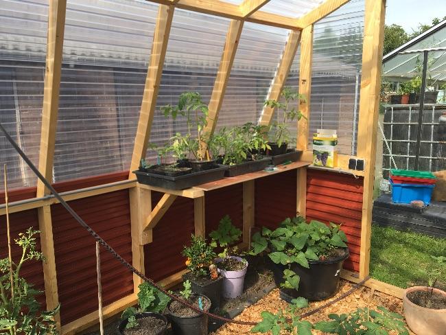 Geplaatst: 4 juni 20196 j Dit ontwerp is dus al eerder genoemd en vrij populair op internet als je gaat zoeken. Op YouTube staan een paar videos en op internet is er eigenlijk maar 1 goede site:https://www.ana-white.com/woodworking-projects/diy-greenhouse Vooraf die YouTube filmpjes bekeken en ik heb echt enorm veel voorbereid werk gedaan, met name de balken / afmetingen.Ik heb geen 2 linkerhanden maar absoluut geen technische achtergrond met timmer- bouwwerk. Het originele ontwerp is ong 3,20 x 3,70. Ik heb er voor gekozen om de kas 3.00 x 4,50 meter te maken! Een goeie vriend van me heeft alles uitgewerkt in Autodesk waardoor we een perfect beeld kregen van alle maten, wat ons énorm veel gepuzzel heeft bespaard! Ik ben nog bezig om alles compleet aan te leveren, overzicht van maten, etc. Maar dat kan nog even duren. We hebben ook timelapse videos gemaakt voor YouTube. Mocht iemand alvast info willen: stuur me even pm. Ik vraag me af waarom de zijwanden ondoorzichtig zijn. Tijdens het scrollen door de foto's spande het er nog om of er tafels in zicht zouden komen, maar nee, duidelijk een pad en al gevorderde plantjes in de grond. Ik had de zijwanden tot beneden aan toe met doorzichtig materiaal gedaan. Wel een mooi degelijk timmerwerk. Om heel eerlijk te zijn, de reden van de zijwanden ondoorzichtig: ik dacht dat daar een hele gegronde reden voor was. Dus ik heb het maar zo gelaten. Er zijn ook kassen / foto’s van mensen die inderdaad het doorzichtige tot grond toe doen.Echter, ik heb er geen spijt van! Sterker nog, ik zou hier weer voor kiezen. De schaduw valt behoorlijk mee omdat de zon vanaf 2e week mei al enorm hoog staat (voldoende). Hierdoor heb ik juist dat bepaalde planten zich véél beter ontwikkelen omdat ze niet continu in de volle zon staan. Er staat namelijk een glazen kas voor, dus dat is mooi vergelijkingsmateriaal ook. Ik ben elk jaar te laat met ophangen verduisteringdoek (wat ook nooit echt goed lukt..).Tevens valt het mij op, maar dat moet ik echt nog aantoonbaar meten, dat deze kas warmer lijkt te voelen dan de glazen kas. Ik weet niet of dit komt doordat de grondaarde in deze houten kas de warmte meer vast houdt (in de glazen kas liggen tegels helemaal), of dat het komt door de zijwanden die dicht (donker) zijn waardoor warmte meer blijft behouden. Een ander, enorm groot voordeel is dat je op hout alles kunt bevestigen!! Wat is dát een genot als je jarenlang metalen kas gewend bent! Zo ook, jawel, de tafels De zon gaat rechts van de tafels op de eerste foto, waardoor de zon eventueel nog onder de tafels kan schijnen (heb er rekening mee gehouden)! Ik heb op 3 punten zo’n hoekbevestiging gezet waardoor ik er losse platen op kan leggen. Mocht ik de ruimte dus wel anders willen benutten kan ik de platen er zo afhalen! Hieronder foto van dezelfde kant, andere hoek. Daaronder staan planten die hoog worden dus geen tafel, maar wel mogelijkheid voor! KostenHout, gekocht bij een houthandel (dus géén Karwei of Gamma oid!!). Complimenten voor onszelf, we hebben uiteindelijk 1 CLS overgehouden!! CLS SLS Vuren balken van 38 x 89 mm en met name veel van 420 / 480 In totaal aan hout ongeveer € 240,-Beits, Karwei, 2 potten a € 35,- totaal € 70,-. Heb nog ruim een kwart over. Zou tevens niet weer eigen merk Karwei doen: is gewoon slechtere kwaliteit waardoor je veel vaker moet behandelen en dus hetzelfde bedrag kwijt bent bij goede beits (en meer werk..). Het dak! Lang en veelvuldig in verdiept. Uiteindelijk besteld via HMG Benelux. Word geleverd vanuit Duitsland. Soort: PVC Damwandplaat 70/185 stuks van 4,5 meter (precies over de gehele breedte dus).3 stuks van 3 meter (voor- en achterkant).2 pakken afstandhouders2 pakken RVS schroeven Vulstroken 10 meter (achteraf niet nodig, koste € 27,-) Kosten incl. Verzending, net geen € 330,-. Dus wel echt alles erbij! Damwand zijkanten heb ik op marktplaats gekocht. Zijn een hoop bedrijven / handelaren die restpartijen verkopen. Ik was € 110,- kwijt voor 5 damwandplaten van 3 meter (1 meter breedte) en nog een pak extra RVS schroeven erbij (speciaal voor damwand met van die rubbers er tussen). AanpassingenDe zijkanten, de randen, daar heb ik toch nog maar hoekpunten / hoeklijnen op gezet. Het is mij een raadsel hoe de anderen dat goed opgelost hebben, zonder dat er (veel) water naar binnen sijpelt. Raam! Een kas moet toch echt een raam hebben! Hoop gepuzzel maar het is uiteindelijk dit geworden:Je kunt het op vorige pagina zien, foto 7 en 12. Bij HMG Benelux heb ik platen gekocht van 1 mm: ik adviseer ten zeerste om 1,2 mm te doen!!! Iets duurder maar 1 mm is echt, ik vrees, te dun! Op een gegeven moment ben je zo erg bezig met plannen en uitvogelen dat je foutjes maakt, dit was er 1 van mijn kant! Elektrisch en water. Zoals je op foto 9 kunt zien heb ik er ook stroom en water in (wat een luxe, vooral stroom!!), dat kost natuurlijk ook extra. Stukjes buis, bochtjes, klemmetjes, wandcontactdozen... reken er maar al snel € 100,- voor (incl. alles, dus ook schroeven, etc). Ik had nog een kadobon van de Welkoop voor nieuwe tuinslang, ook weer 2 tientjes . Maar dit zijn uitgaves waar je wel op kunt besparen als het moet en je rustig bijvoorbeeld marktplaats in de gaten kunt houden. Versteviging wanden. Misschien omdat mijn kas langer is dan het originele ontwerp, maar ik vind toch echt wel dat er nog balken tussen de zijspannen van het dak moet! Volgens mij gaat get anders echt te veel heen en weer, met kans op barsten in het dakprofiel! Op foto 7 zie je dus het geraamte nog zonder deze tussenbalken (zo noem ik het maar even). Dit idee zag ik op YouTube bij iemand voorbij komen! Tot slot nog een foto van de deur, die miste nog! Hier zie je ook goed de hoeklijnen. Heb de ondersten natuurlijk even mooi rood geverfd (ook weer 20 euro...). Deur was gratis, zelf maken of gebruikte deur ben je ook rond 20 / 50 euro kwijt. Kosten totaal- Hout CLS € 240,-- Dak e.d € 330,-- Damwand zijkant € 110,-- Beits € 70,-- Hoeklijnen 