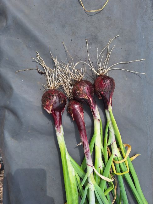 Knoflook, tatsoi en rode uien geoogst.