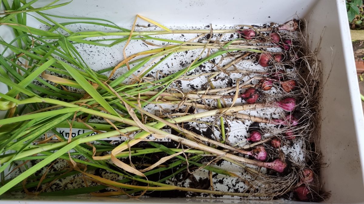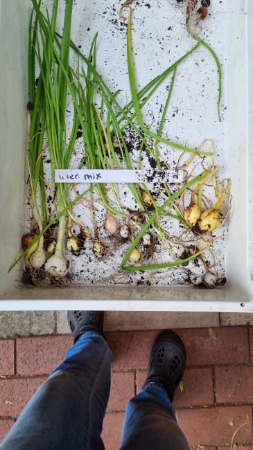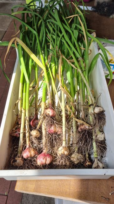 Alle knoflook, op 1 bak na. Die laat ik groeien. En de uien eruit gehaald. Het meeste loof zag er niet meer uit en heel veel was omgevallen en bedekte mijn andere groente in de speciebak ernaast. Niet erg groot, maar alles goed te eten denk ik.