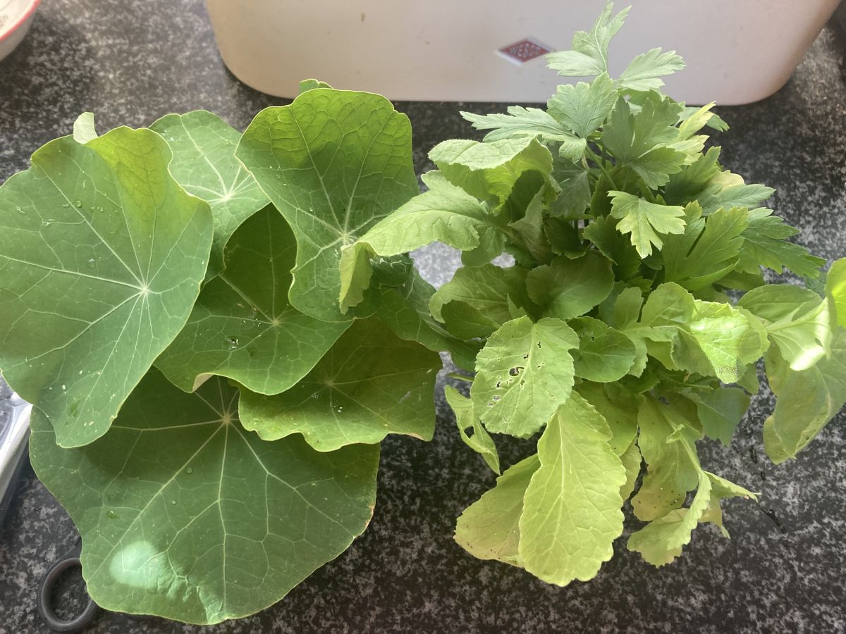 Aangezien inmiddels duidelijk is dat de ongeveer 35 radijsplantjes maar 4 radijzen gaan opleveren heb ik wat plantjes uitgetrokken voor de pesto. Samen met wat OI-kers en platte peterselie net geoogst.