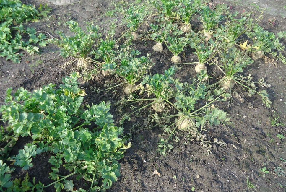 Pas als het echt gaat vriezen haal ik de dikste knollen uit de grond. Wortels een beetje bijsnijden, blad er af tot de hartbladeren. In kratjes met zand zetten, en vullen tot de bladrand van de knollen. Hier is dat wit schoon droog zand. Gaat ook goed. En echt, ik heb elk voorjaar knolselderij alsof het vers uit de grond komt, terwijl we dan te maken hebben met 'the hungry gap' zoals de Engelsen dat noemen, wanneer er niets vers te oogsten is.