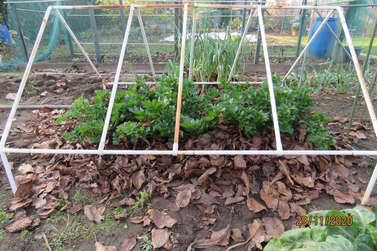 De kuip staat gedurende de winter in de koude kas en om ook de bovenzijde van de knollen tegen vorst te beschermen vul ik de kuip verder aan met droge bladeren. Is er méér bescherming nodig dan kan er altijd nog een stuk bubble plastic en/of dekzeil over heen.