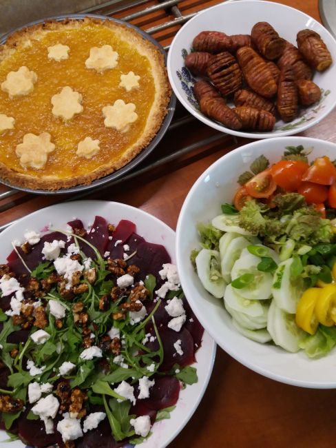 Geplaatst: 11 augustus 20205 j Lekker sla, tomaten, komkommer enz. Uet. En de bietencarpaccio...dat blijft lekker. die gekke ronde dingen zijn aardappeltjes, ingesneden, met olie met kruiden ingevet en in de airfryer. Was erg lekker. enne....een jamtaartje ( recept Landleven.nl). Handig om een teveel, of “ oude” potten jam op te maken, er gaat een pot op een taartje!