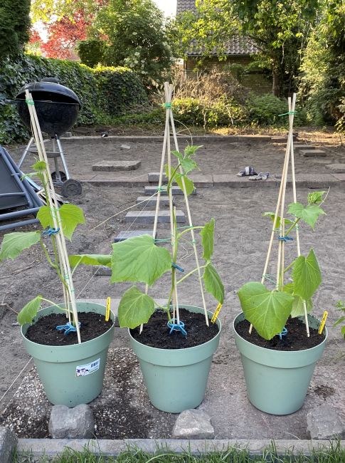 Mijn snack komkommer planten barstten bijna uit hun vorige potjes dus over gezet naar grotere potten. Het zal nog eens moeten vrees ik, maar helaas zoals je op de achtergrond ziet, is de tuin nog in aanleg en de bak waar ze in moeten, komt pas over een paar weken. Even zelf wat geknutseld dat ze een klimrekje hebben voor de komende tijd.