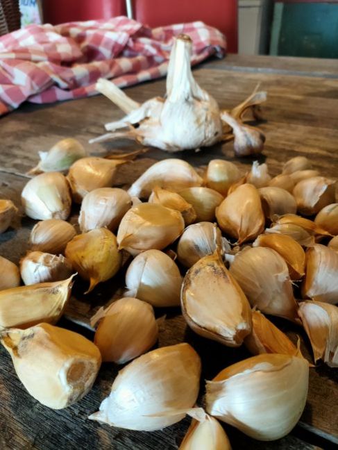 Begonnen met de olifanten te oogsten en als de bbq aan is geweest dan pof ik nog even zo n bol. Het zachte binnenste uit de tenen is al gebruikt al basis van slasaus en als Een soort boter op brood, onder een tomaatje met blaadjes basilicum En wat peper.