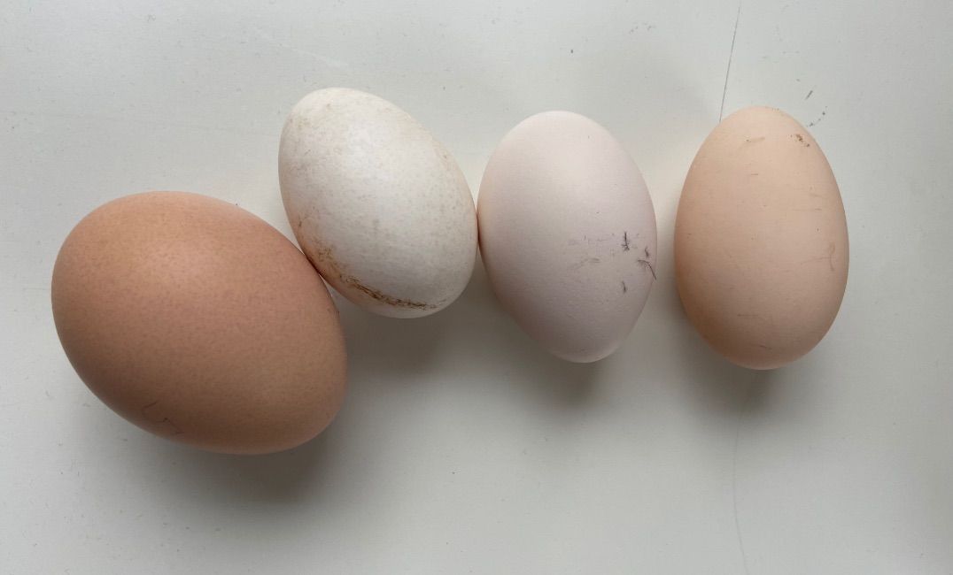 Vlnr: groot ei van de kippen van een ‘buurvrouw’, gister een modderig eitje van Kraai (denk ik), vandaag een wit eitje van Janice en de lichtbruine is van Katrientje.  🥚🥚🥚😊