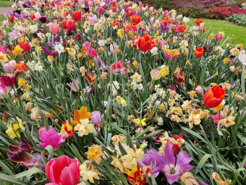 Ongeveer 450 bloembollen uit verschillende bronnen, om een stuk van 4 m2 mee vol te stoppen. Dit voorjaar op de Keukenhof vond ik de mixen het mooiste. Zoals dit.