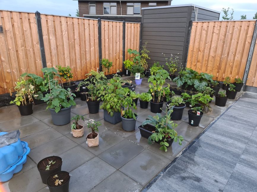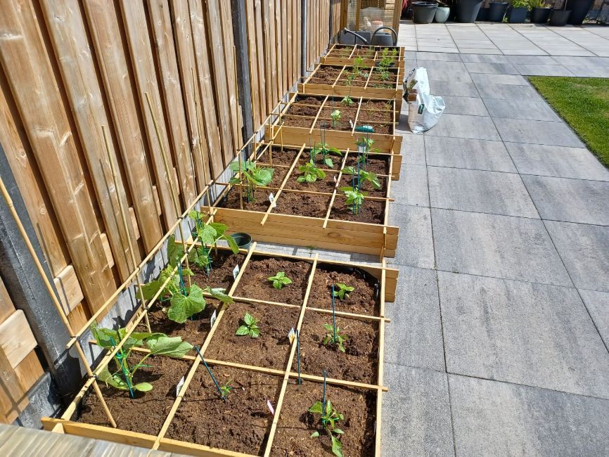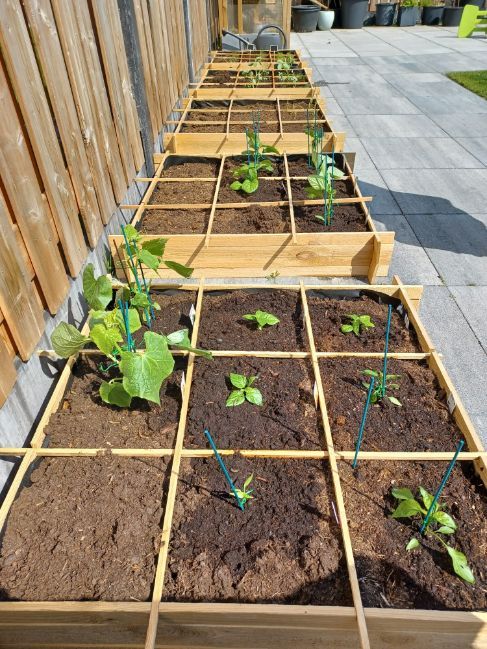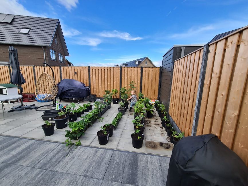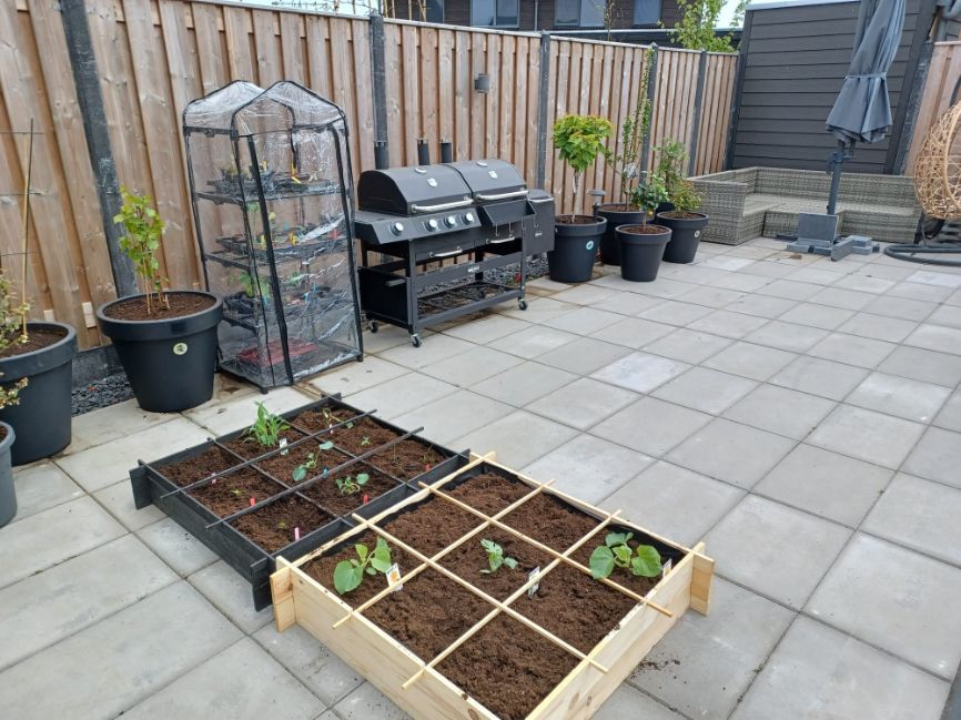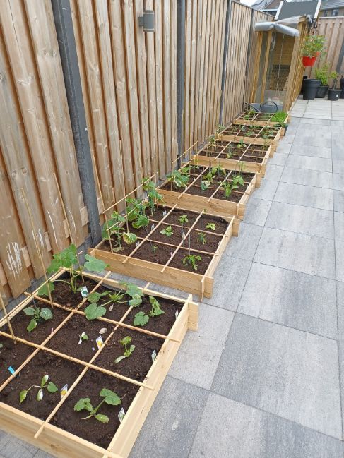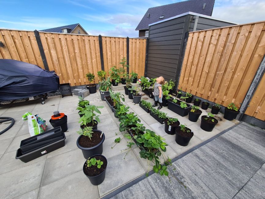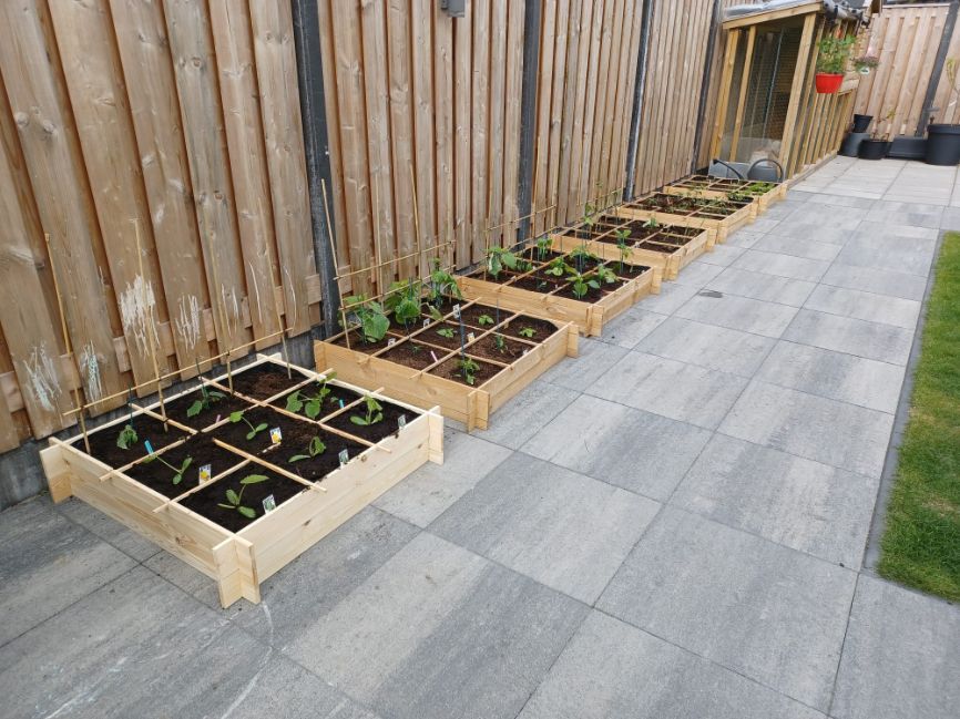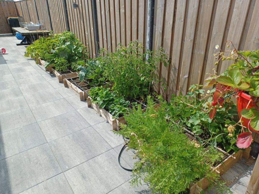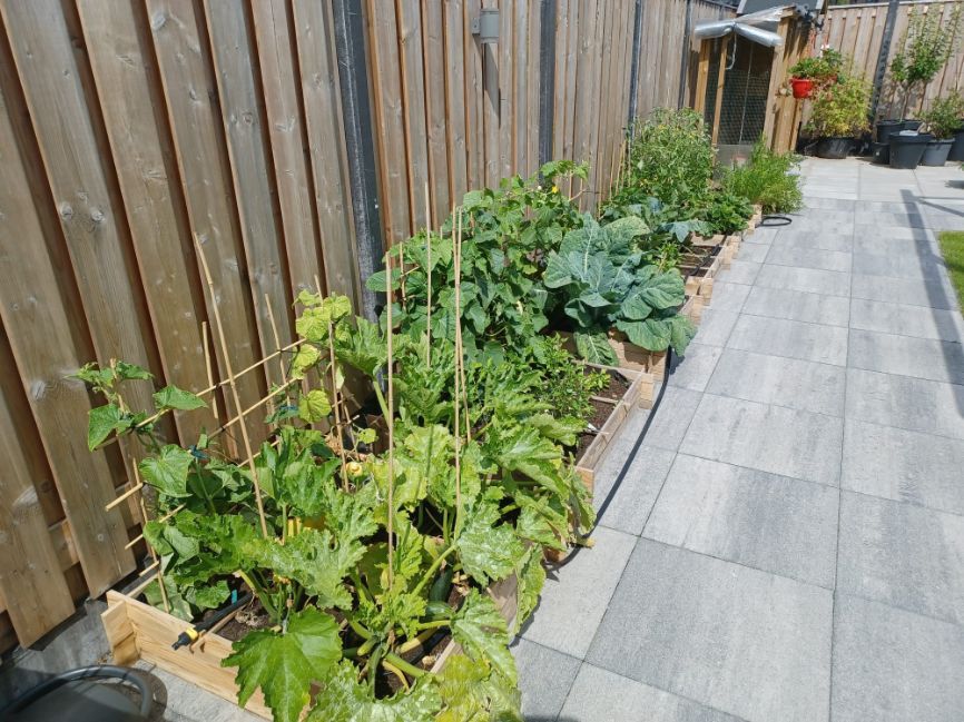 Geplaatst: 25 juni 20223 j Hoi! Ik ben Ruben, 33 en woon samen met mijn vrouw en twee kinderen (2 en 5) in Heerhugowaard. Twee jaar terug in Heerhugowaard komen wonen waar we een vrij grote achtertuin hebben (12 bij 11 meter) Vorig jaar begonnen met het kweken van wat groentes in potten. Dat ging eigenlijk wel heel erg goed. Heel veel komkommers, courgettes, aubergines en rode/gele pepers vanaf kunnen halen. Gezien ik aardig wat Surinaamse collega`s heb namen de pepers gretig aftrek gezien ze ook zeer pittig waren. Dus dat moest een stapje groter. Eerst de familie uitgebreid met kippen. We hebben er inmiddels 9 die af en toe door de tuin scharrelen. Dit jaar moest het wat groter en kwamen we toevallig vierkante meter bakken tegen: We begonnen met 5 vierkante meter bakken maar dat zijn er inmiddels 8 geworden. Het e.e.a eerst opgekweekt binnen vanaf zaad. Daarna naar buiten in een kweekkasje of door de grond in. Inmiddels ziet er er nu zo uit: We merken dat we iets te enthousiast zijn geweest met de hoeveelheden of de verdeling. Staat een beetje vol. Maar we hebben al genoeg kunnen oogsten: De eerste augurken zijn ingemaakt en al heerlijke courgettesoep en courgettepasta kunnen maken. Achter in de tuin staan nog wat fruitbomen De kinderen vinden het heerlijk om zo even wat uit de tuin te plukken of om samen te kijken of er al wat klaar is wat ze kunnen eten. Wel veel last van rupsen van het koolwitje. Maarja ook die moeten te eten hebben dus laten we lekker gaan. Volgend jaar willen we toch een aantal stenen eruit gaan halen en op de plekken waar nu de vierkante meter tuintjes staan gewoon een moestuintje van te maken. Dus van klein steeds een stukje groter.