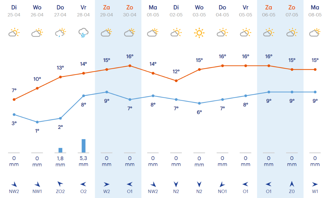 Overdag is het dinsdag met 10 tot 15 graden fris voor de tijd van het jaar. In de nacht naar woensdag wordt het nog kouder en zakt de temperatuur naar 1 tot 3 graden. Aan de grond gaat het dan waarschijnlijk op grote schaal vriezen, verwacht het weerbureau. De kou blijft echter beperkt tot één nachtje, want de komende nachten verlopen zachter. In de nacht van donderdag op vrijdag wordt het zelfs niet kouder dan 9 tot 12 graden.