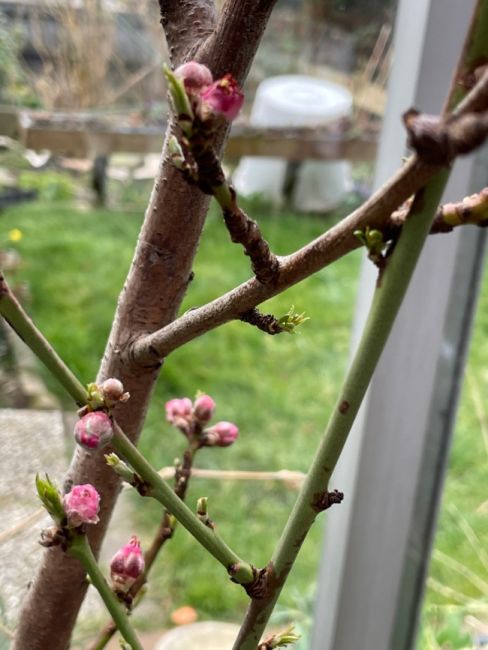 De fruitbomen buiten (perzik, kers, peer) zijn nog niet zover. De opzwellende knoppen beloven wel al veel. Ik verwacht dat de perzik komende week wel gaat bloeien.