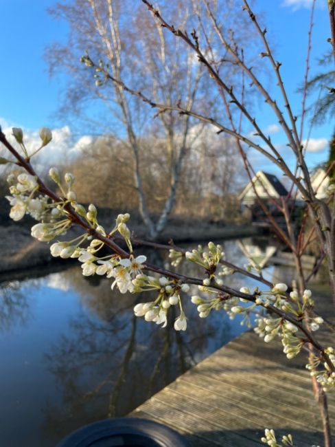 De perzikachtigen zijn dik een maand later dan normaal. Meestal heb ik rond de verjaardagen in februari al bloeiende perziken. Dit jaar nu pas.