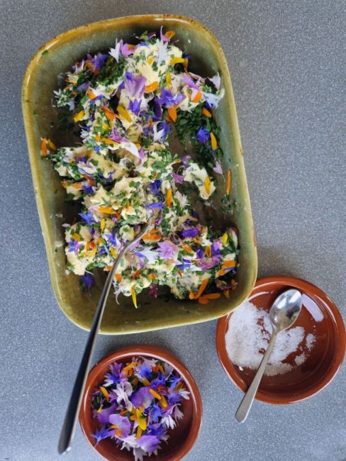 Geplaatst: 15 juni 20232 j Wij gebruiken niet echt een recept voor bloemenboter. Maar net afhankelijk van waar we zin in hebben en wat er in de tuin/in huis is. Basis is altijd een pakje ongezouten roomboter dat we op kamertemperatuur laten komen en daarna zeezout (en vaak ook wat citroensap) aan toe voegen. Daarna mengen we een heleboel blaadjes van eetbare bloemen naar keuze (viooltjes, goudsbloem, Korenbloem, Oost Indische kers) door de boter. Afhankelijk van waar we zin in hebben voegen we soms ook nog toe: gepofte knoflook, kruiden, sinaasappelschil etc. Als we de boter willen bewaren, maken we er een "rol" van. Wikkelen die in vershoudfolie en stoppen we het in de vriezer. Dan kunnen we als we het gebruiken een plak afsnijden. 15 juni 20232 j aangepast door Vastone