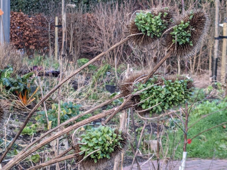 Geplaatst: 7 januari 20242 j Koude winterwandeling. Gelukkig was er zon! In het bos was het minder guur. En we vonden ijshaar! In de tuin komen bollen op die ik met Kerst pootte. Als dat maar goed gaat... De kaardebollen hebben ook al plannen voor het nieuwe seizoen. Ook onze thermometer stond boven nul, maar in het vogelbadje moest ik ook een wakje hakken.