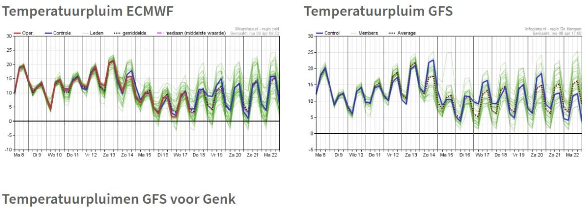 Geplaatst: 8 april 20241 j Als je naar de 'pluim' van het KNMI kijkt dan zie je dat er een kans is op nachtvorst maar dat die kans VOORALSNOG niet bijzonder groot is, zeker niet in het westen van het land (iets grotere kans in het zuiden en oosten). Bovendien is het weer 10-12 dagen van tevoren lastig te voorspellen. De onzekerheidsfactor is simpelweg te groot. 3 dagen gaat goed, 5 dagen al wat minder, 10 dagen zeer lastig.