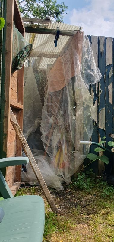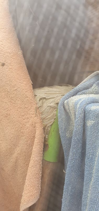 Geplaatst: 25 juni 202525 Jun Auteur Hier dus het net, met een hele bende kwade wespen. Die bruinrode handdoek heb ik dus eerder opgehangen. Na een paar uur zo dit te hebben gelaten heb ik de handoek bij het klemmetje losgemaakt. Handdoek viel halfweg, bleef toen aan het nest hangen. Ik maar niet verder getreiterd. Er zit een gat in het dakje, wat hun vliegroute is. (Buurmans dak vloog ooit in storm weg, landde tussentijds op mijn hok voor het in de sloot belandde, waaruit het weer gered is. maar ik dus gat in mn dak.)En bleek dat ze de handdoek al hadden geintegreerd in hun nest. Evenals de hark. Dus de les die ik leer, kleine wespenbolletjes toch maar verplaatsen voor het te laat is. Vorige nestjes bleven klein... niet invasief of agressief... dit is echt anders....