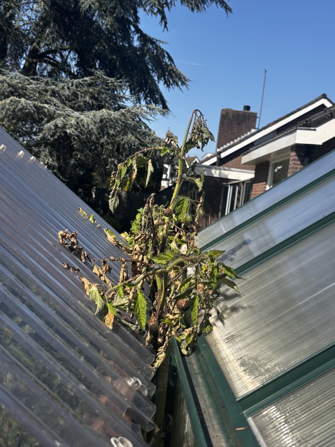 En dan kom je thuis van vakantie en hebben de achterste drie planten in de kas beginnende phytophtora. Ik kan wel janken. Enfin, morgen direct alles rooien daar. Wat kan ik doen met de rest van de tomaten die er nog aan hangt, merendeels heel groen? Enfin hoe bescherm ik de overgebleven planten voorin mijn kas?