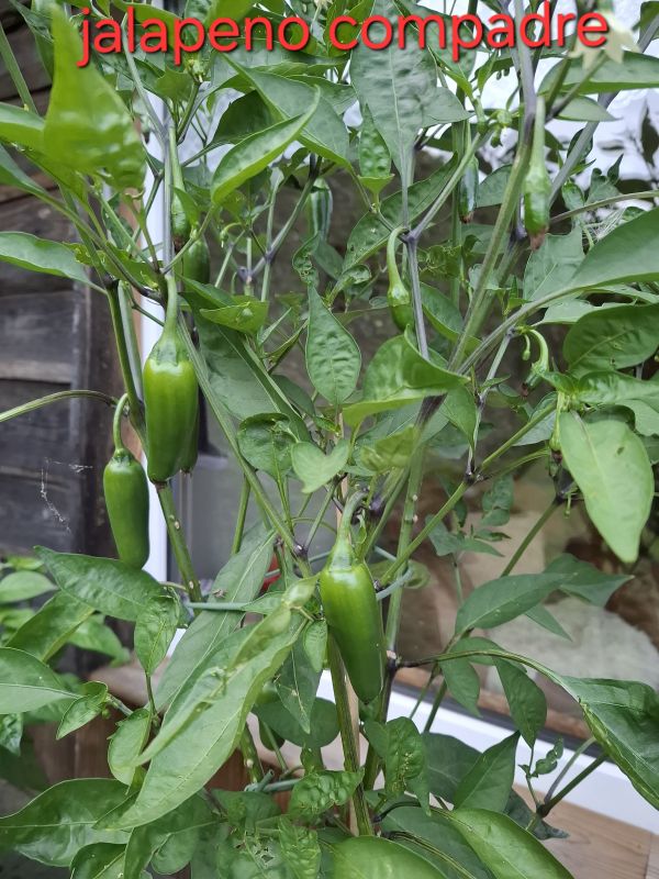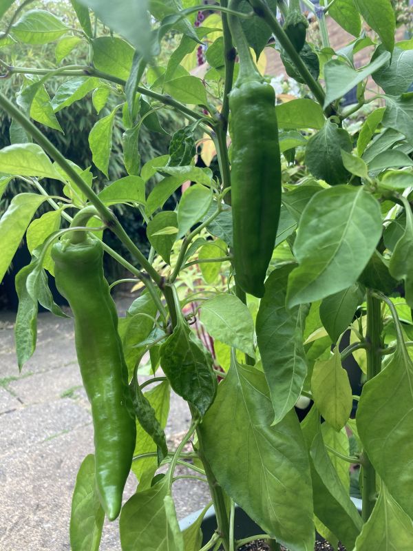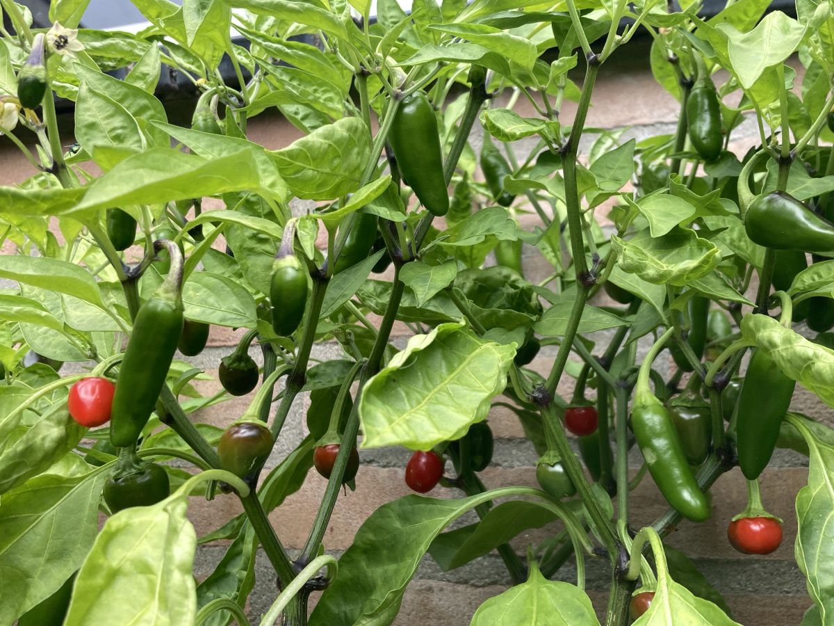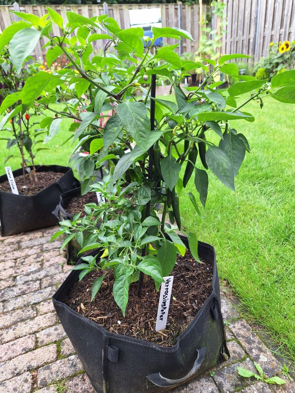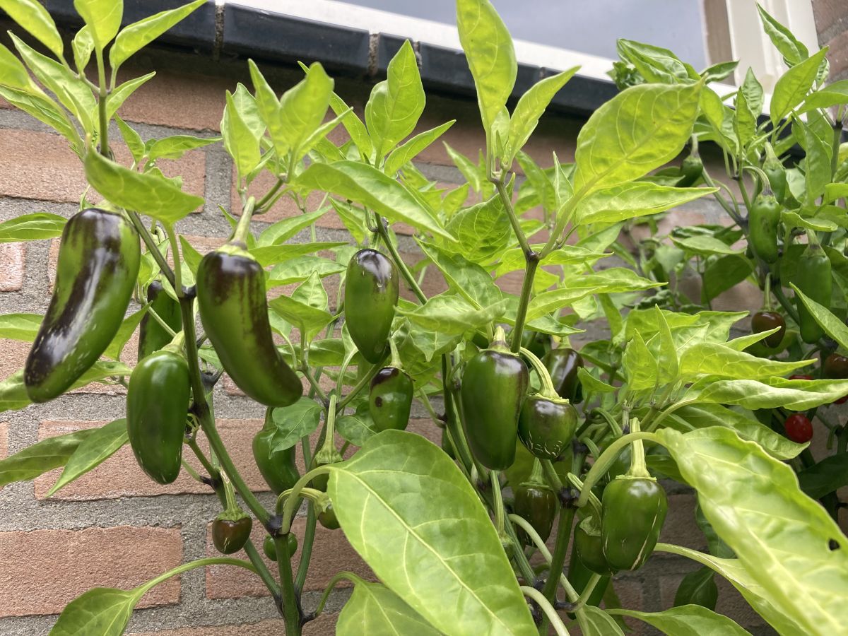 De Jalapeno’s gaan best goed. De ene pot geeft veel ‘bessen’, de andere meer traditionele vorm. Er ligt inmiddels al een en ander in de vriezer.