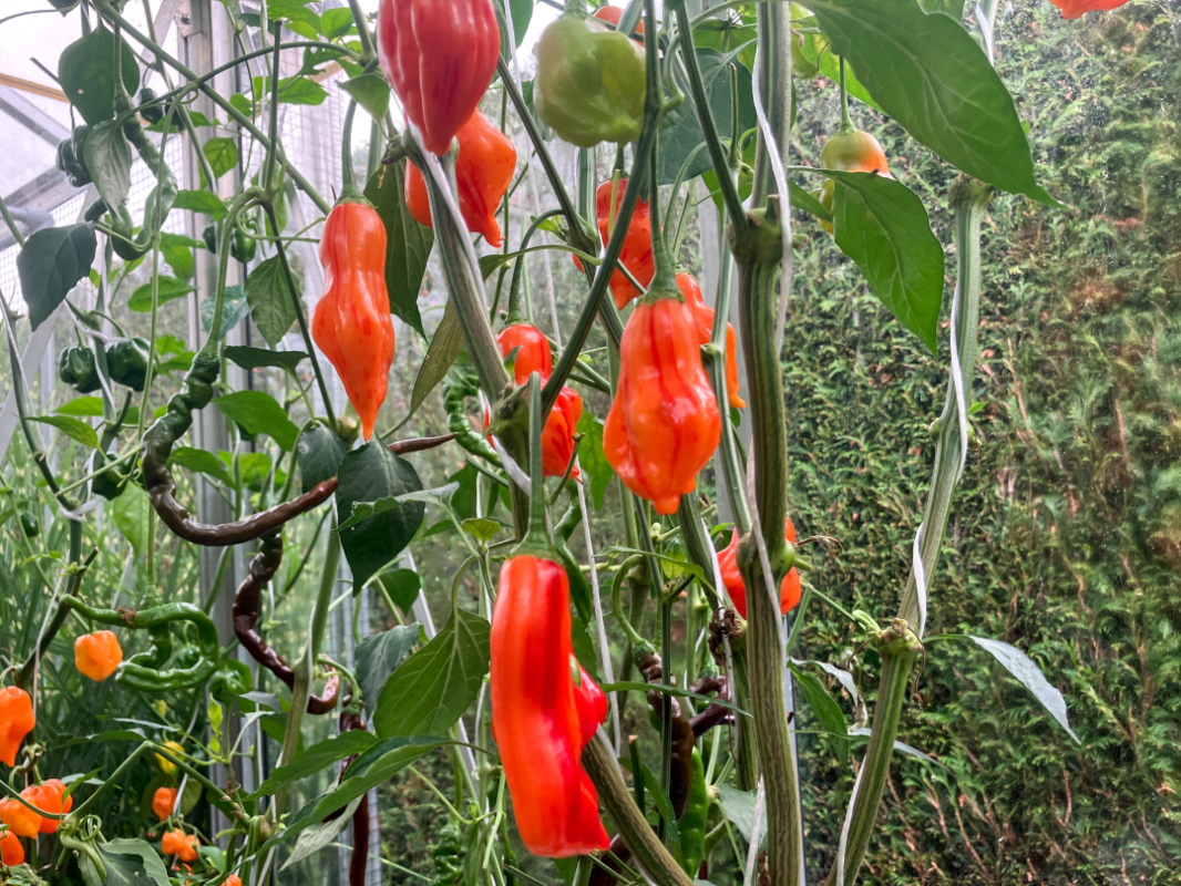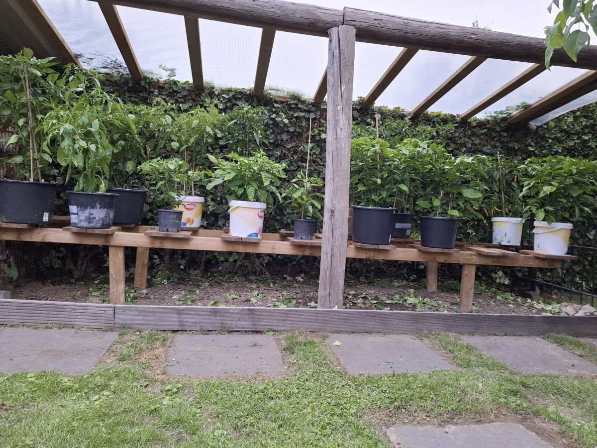 Hier zijn de pepers tijdens onze afwezigheid goed gegroeid. Voorlopig nog niet op kleur (behalve sommige Jalapeno’s en wat Cabaca Peach), maar wel al aardig op formaat.