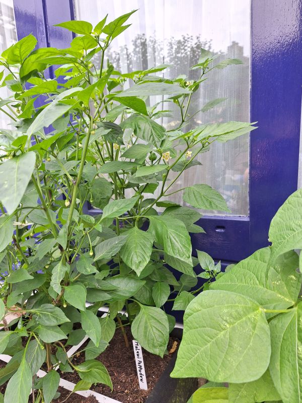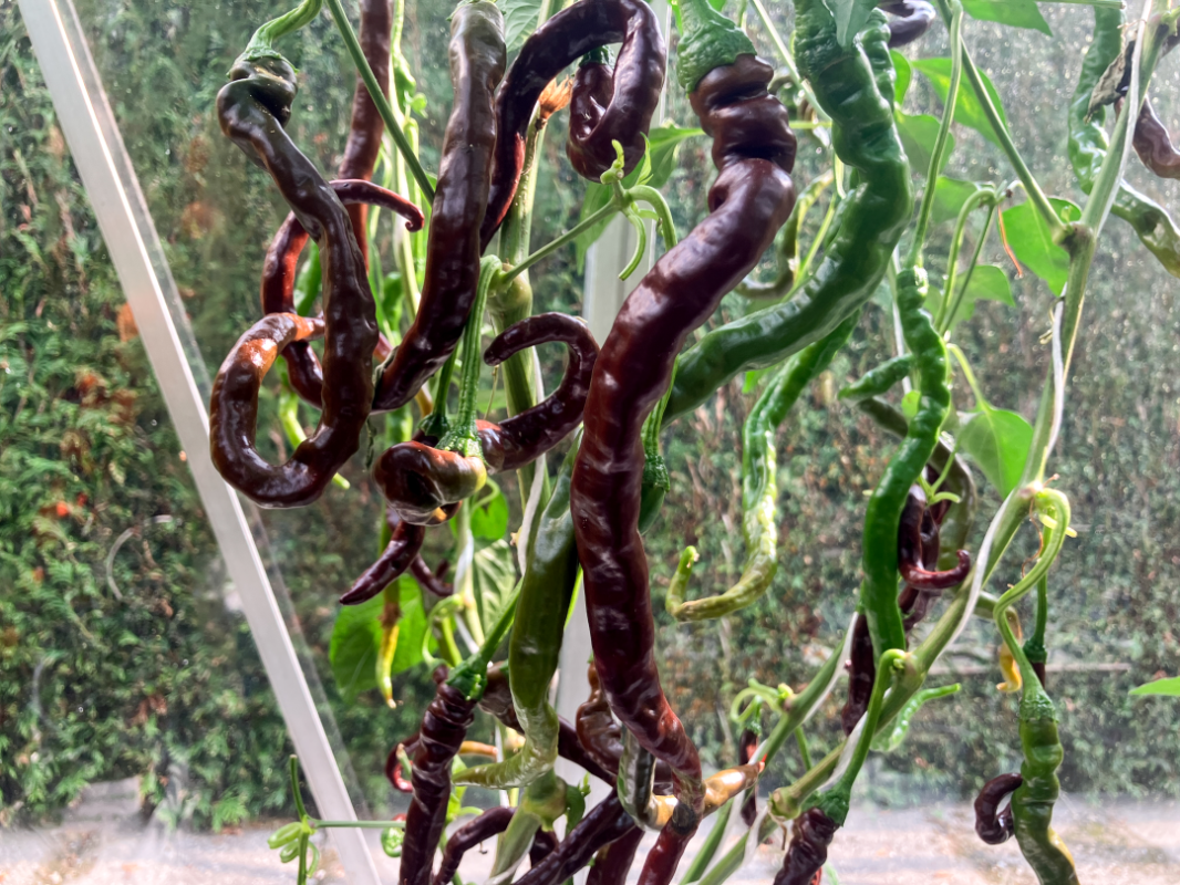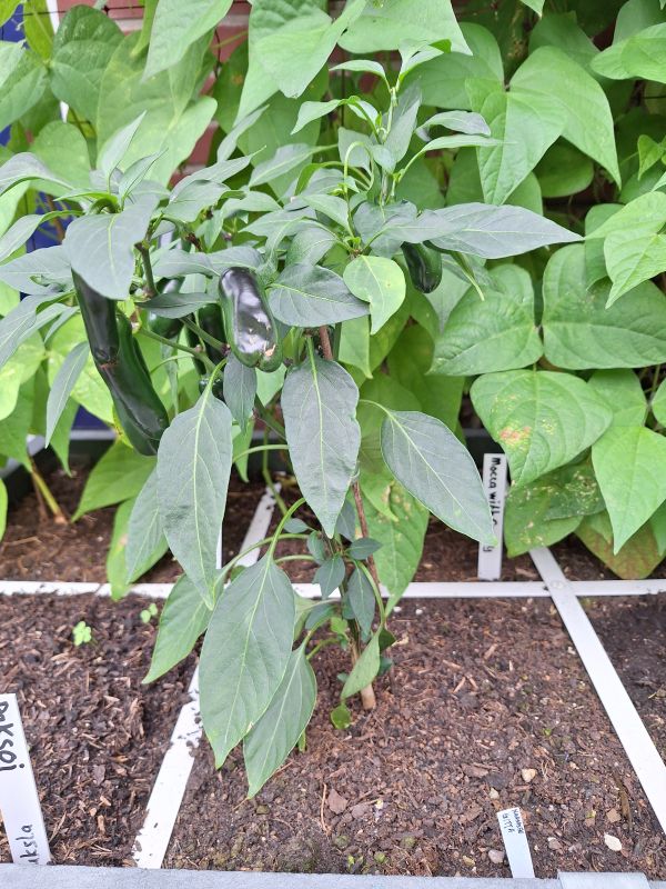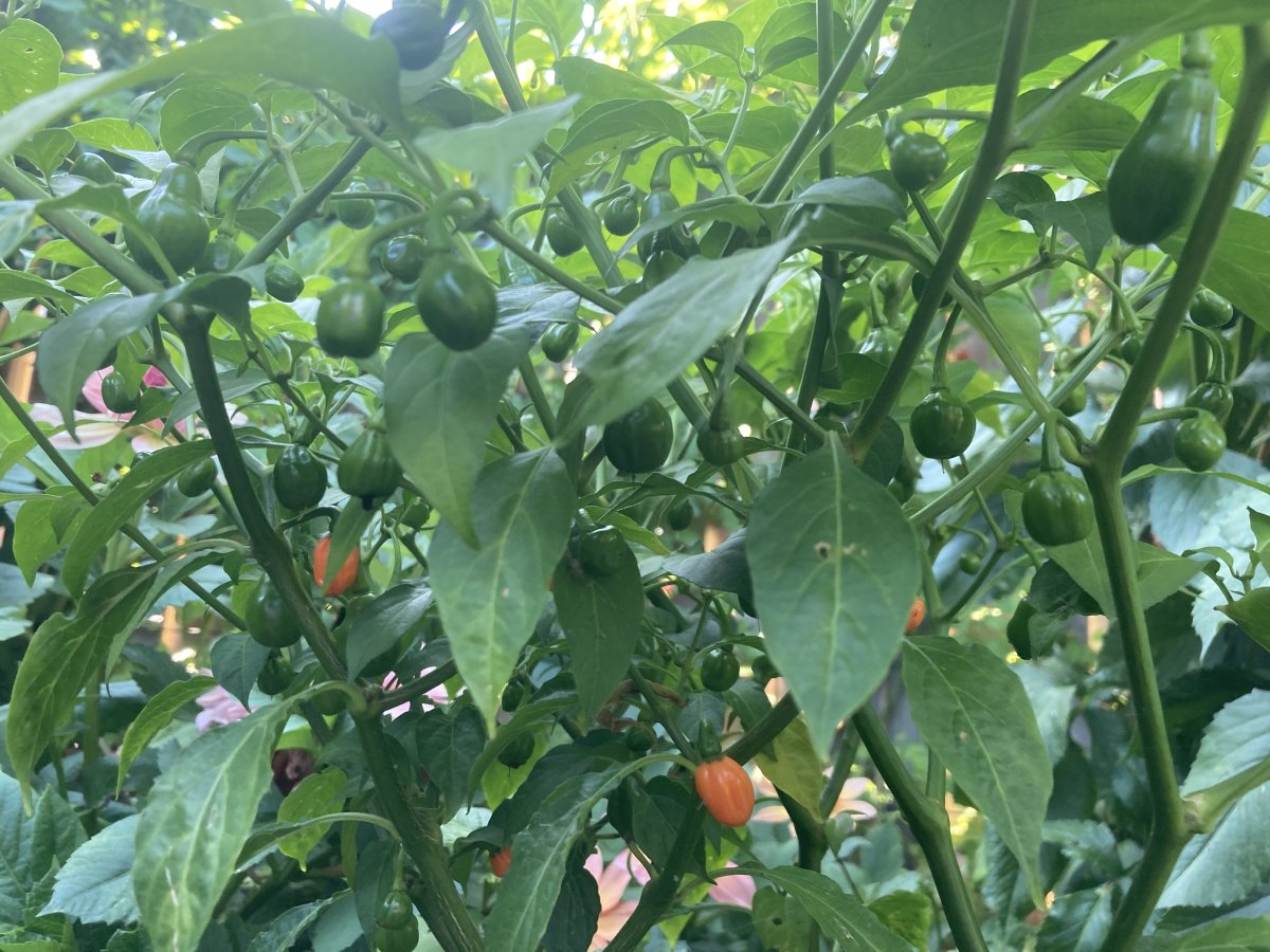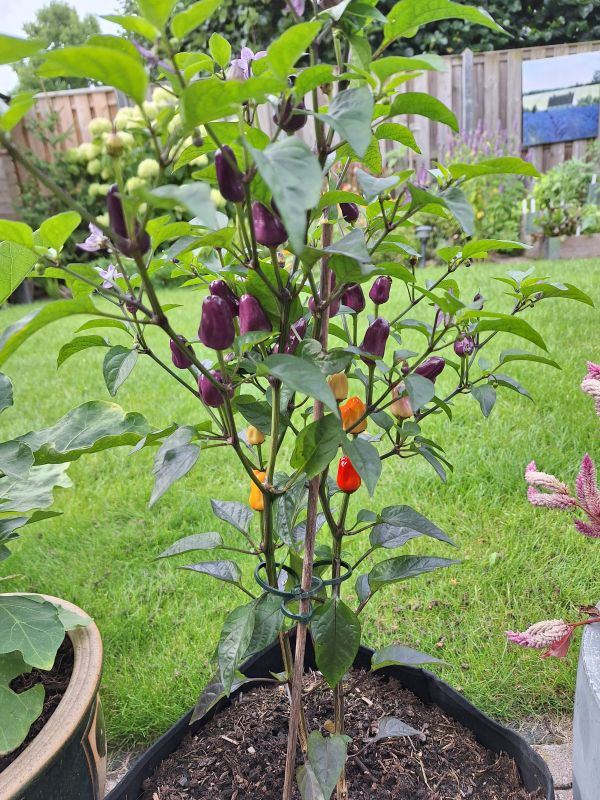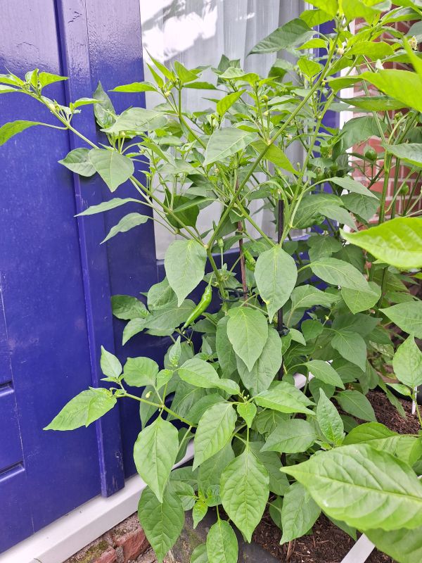 Als moestuinierder met weinig kennis van pepers kweken (had me daar nog niet eerder aan gewaagd wegens gebrek aan warmte en licht) dacht ik in mijn onnozelheid dat de bolivian rainbow in alle kleuren tegelijk zou groeien. Dus was ik een tijdje best teleurgesteld dat er alleen maar paarse aan groeiden. Maar nu zie ik dat ze verkleuren, en natuurlijk doen ze dat want duh dat doen alle pepers en paprika’s. Goeiemorgen, ook wakker. Maar enfin. Wij vonden - niet veel gewend - de paarse al behoorlijk pittig, vooral toen Cor er per ongeluk iets teveel tegelijk van door de bonenschotel gooide. Inmiddels heb ik geleerd dat ze van paars naar geel naar oranje naar rood verkleuren. We hebben momenteel een aantal paarse en één oranje aan de struik hangen. Ben benieuwd hoe heet de rode dan uiteindelijk zullen zijn.