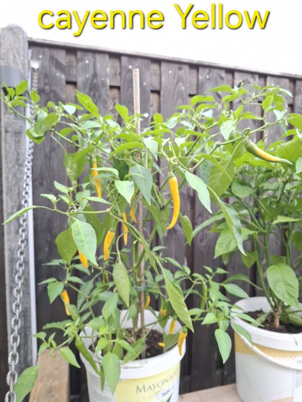 In de grote 200 ltr pot hangen ook enkele cayenne red (foto volgt later, ben ik vergeten). Een hele grote pot heeft volgens mij niet echt voordelen. Lijkt er op dat de plant heel lang bezig is geweest om een groot wortelstelsel aan te leggen, waardoor boven de grond lange tijd niets is gebeurd.