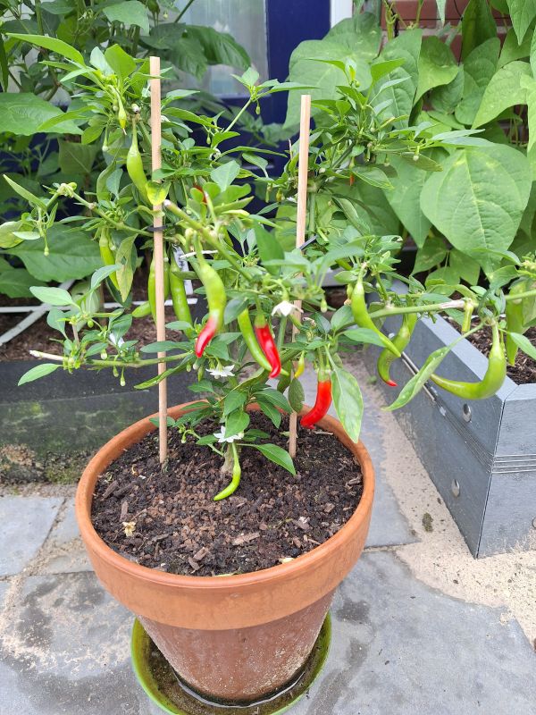 Van de chilli peper heel veel en van de Espelette dus 2 pepers kunnen oogsten. De rest is nog groen of begint te kleuren. Van chinese 5 color is de onderste bijna rijp.