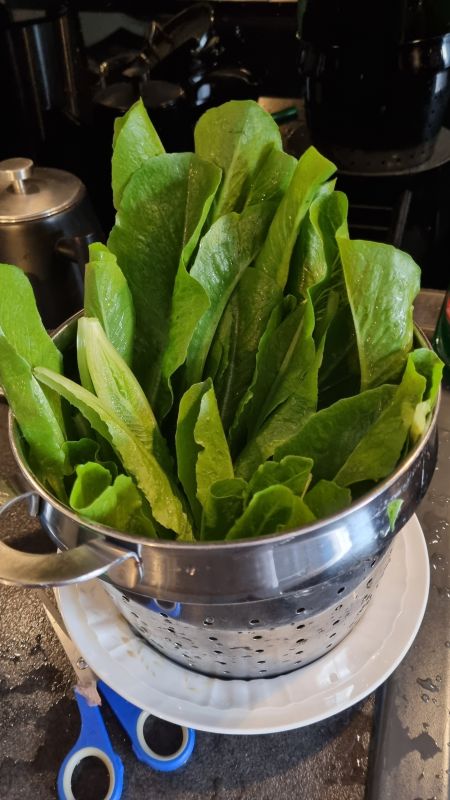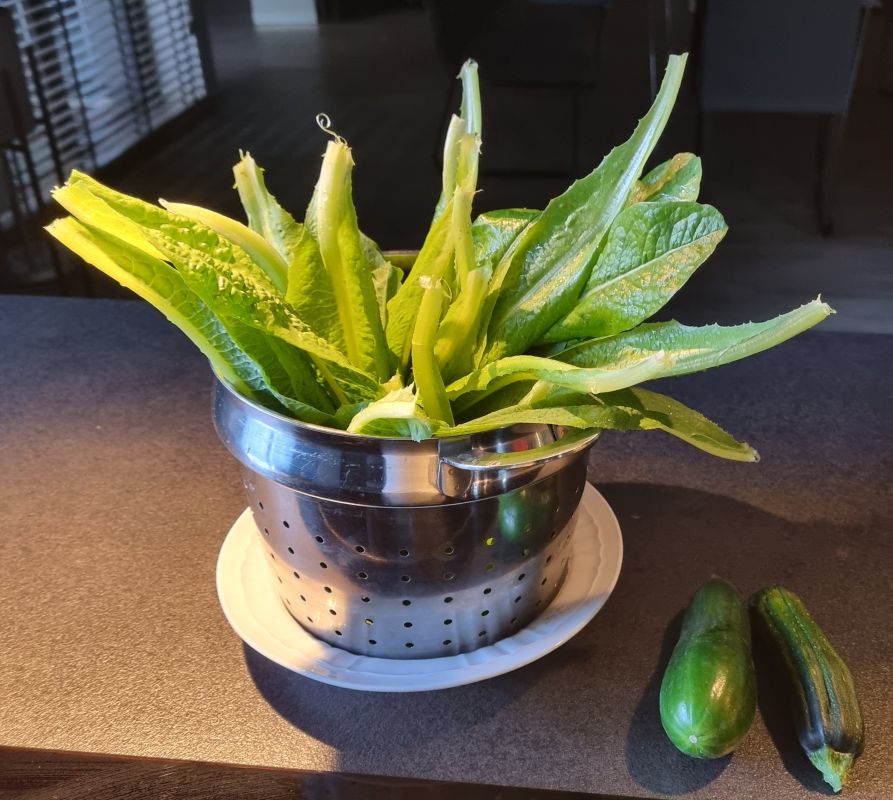 Ja de Auvona. Die had ik geplaatst ter bescherming van mijn bloemkool en die was heel hoog geworden. Vorig jaar oogstte ik het sneller en dan is het zachter, maar toch niet ons favoriet. Wel de Salanovas, maar een enkele kan ik elders bestellen gelukkig.