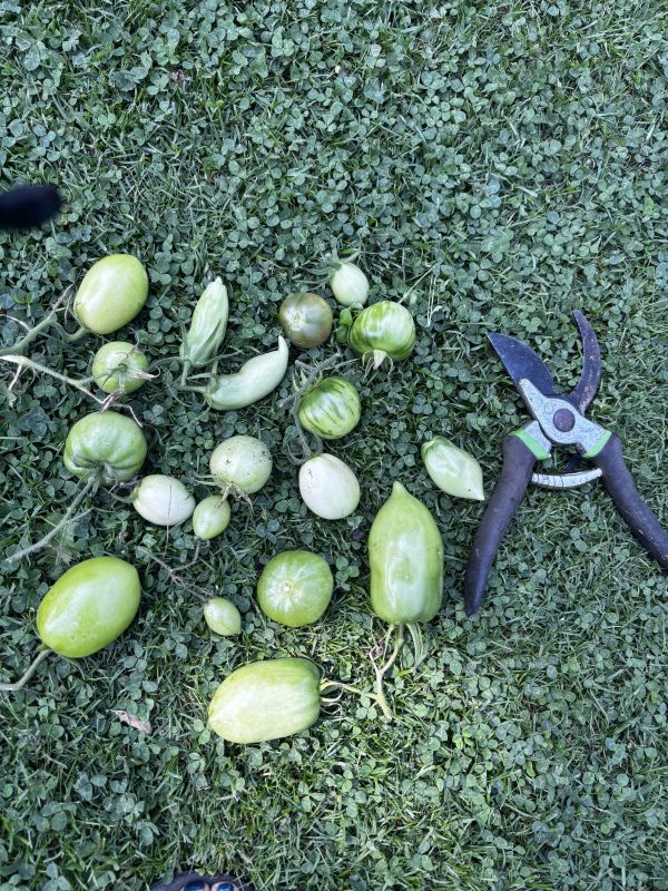 Ondertussen in de kas (48,8 graden…) de tomaten gesnoeid/gedieft/getopt. Sommigen in zijn geheel verwijderd omdat er toch geen rijpe tomaten meer aan gaan komen… was een kliko vol.