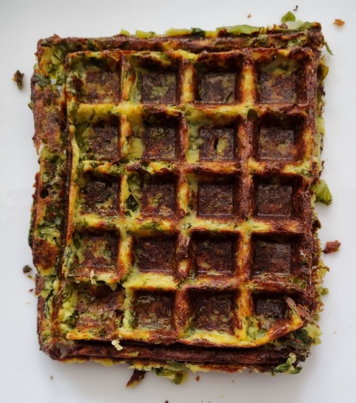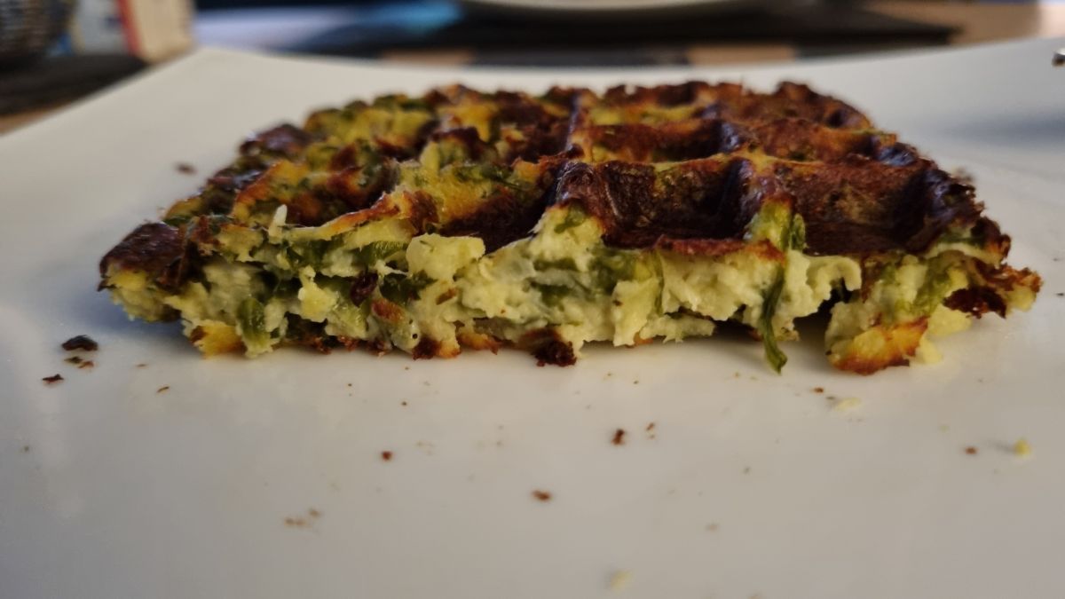 Ik heb een andijvie-aardappel wafel gebakken. De hoeveelheid beslag was iets te veel voor 2 wafels en liet het daardoor wat langer bakken. Dat kan korter. Dus volgende week ga ik het nog een keer maken met andere hoeveelheden en dan zal ik het in het hoofdstuk wafels het recept zetten.