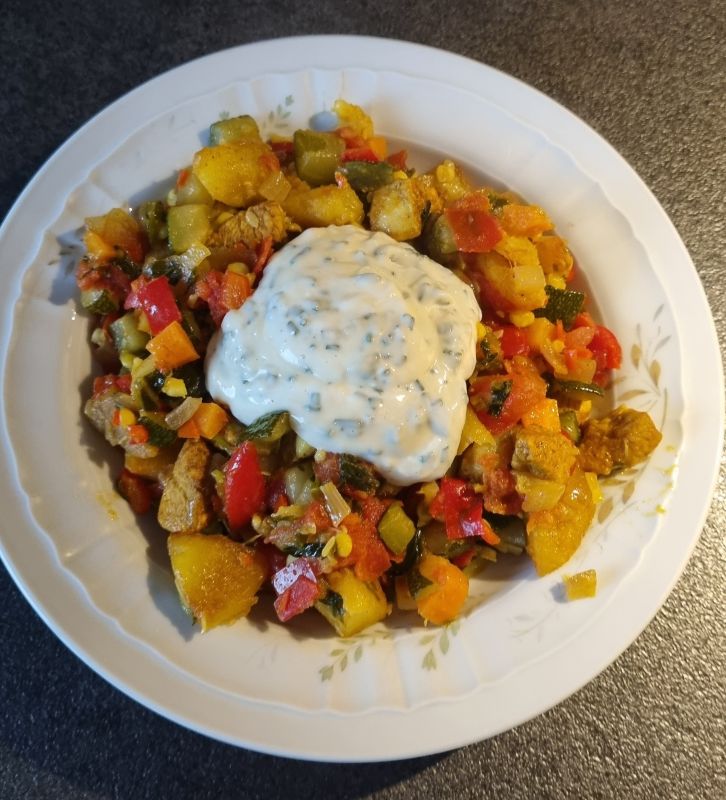 Gebakken aardappeltjes (eerst voorgekookt) en dan met kip en heel veel groentes, de meeste uet. En ja met knoflooksaus met bieslook.