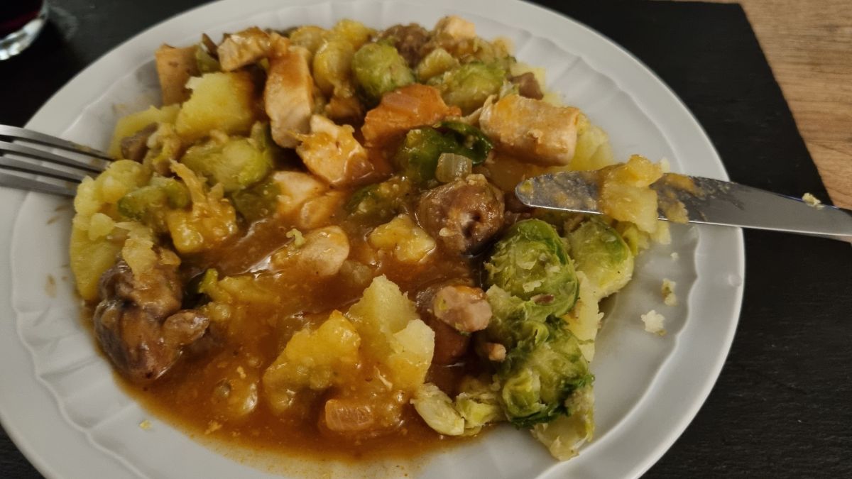 Aardappelen, spruiten. Pittige jus, kip en kastanjes. Alleen de ui en knoflook uet.