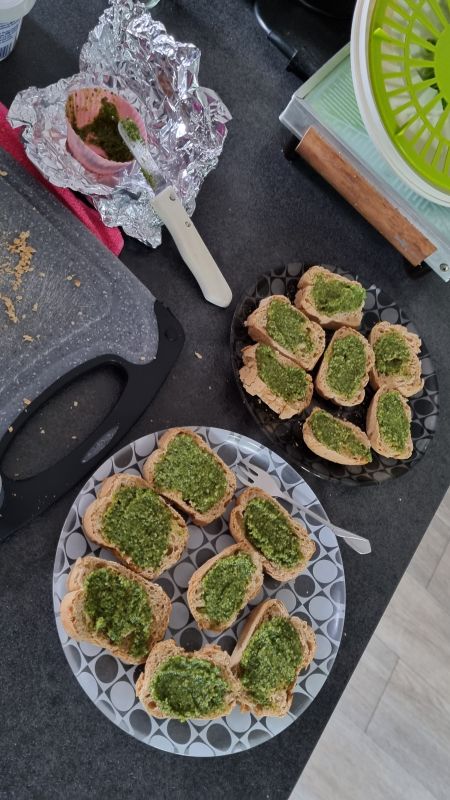 Omdat wij de laatste dagen geen brood eten, maar laat gebak met koffie. Dan maar broodjes afgebakken en mijn eigen pesto uit de vriezer gehaald tegen 16.00 uur. En 's avonds zalmpotje met 300 gram snijbiet uit de vriezer en 100 gr verse spinazie erdoor. Heerlijk!