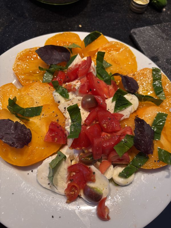 Ow en een prachtige salade met accordeon bicolor tomaat (geel) en wat cherry tomaatjes in diverse kleuren en 2 soorten basilicum.