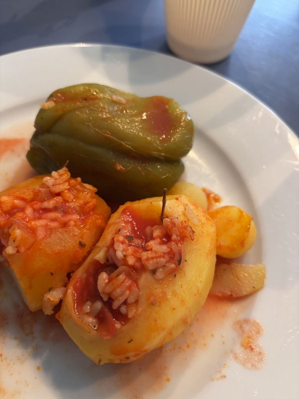 Gevulde pepers paprika’s en aardappel met eigen pepers paprika’s knof, tomaten, kruiden en yoghurt. Lekkkkerrrrr
