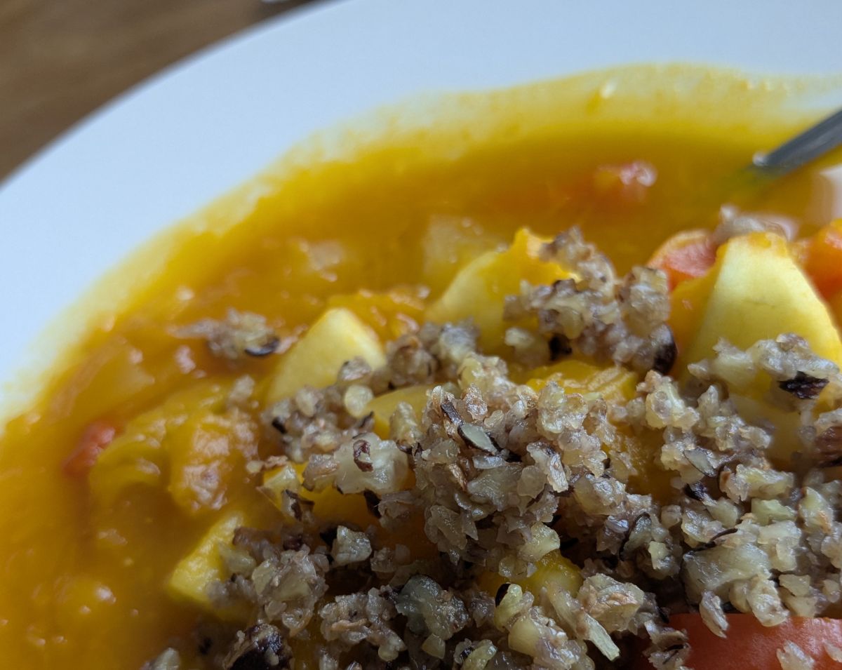 Pompoensoep met appel en paprika en ui, met wat gekruimelde gebakken kastanje en hazelnoten er bovenop. Vrijwel alles uet.