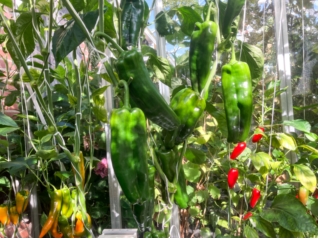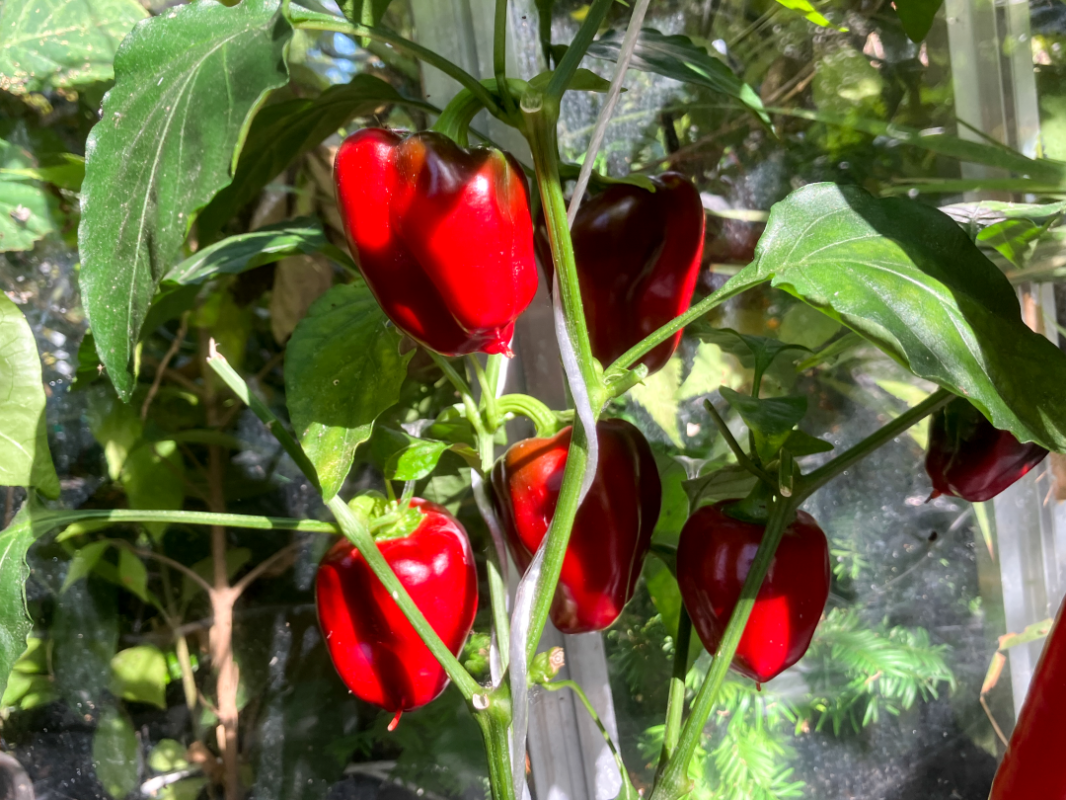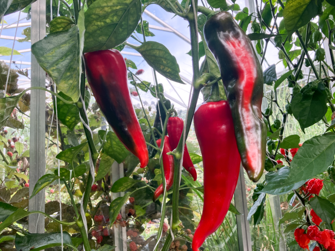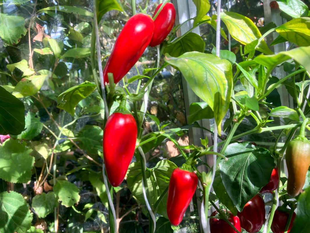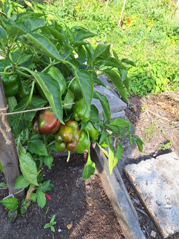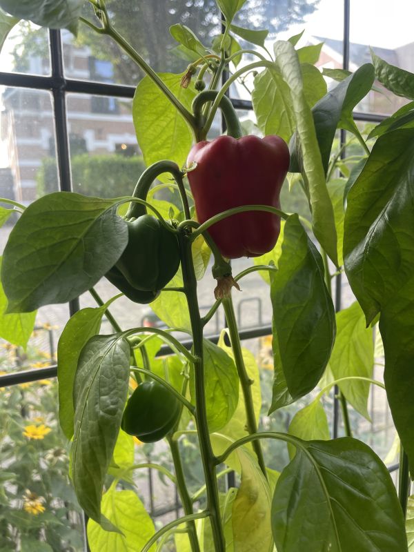 Hier willen de paprika’s ook niet kleuren. Ik snap er niets van. Ik begreep dat paprika’s kleuren door warmte, niet per se door de zon. Maar ik had de foliekas enkele dagen geleden voor de storm dicht gedaan, en vergeten weer te openen. Toen ik er gisteren na enkele dagen weer kwam, was het er letterlijk bloedheet. Maar geen enkel rood spoortje op de paprika’s… 🫣