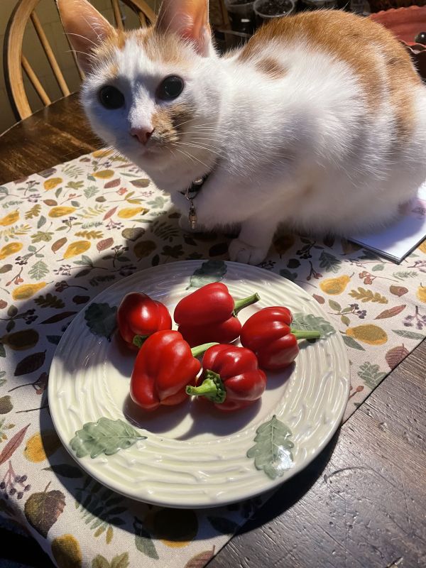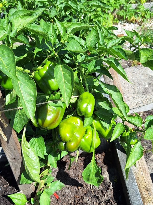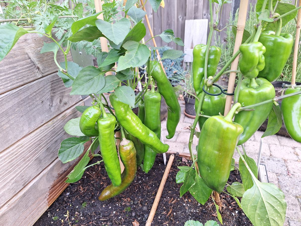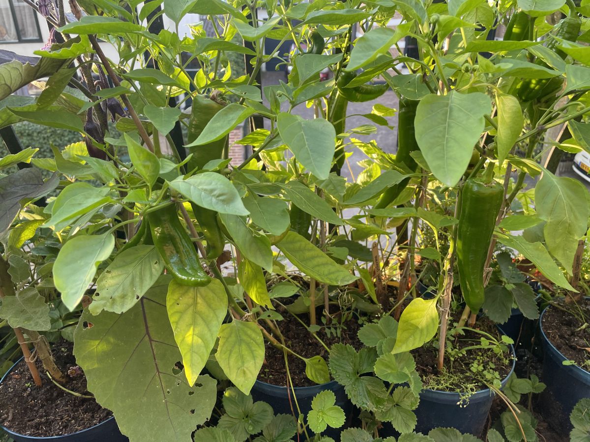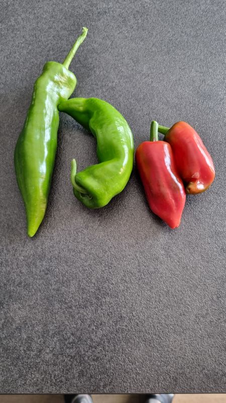 De eerste 2 puntpaprika's geoogst. Deze zijn de grootste. Ze willen allemaal niet rood worden. Misschien dat de kleinere ook groter worden en ik hoop ook een beetje rood. Dank je @Gitta voor de plantjes. Mij lukte het dit jaar niet.