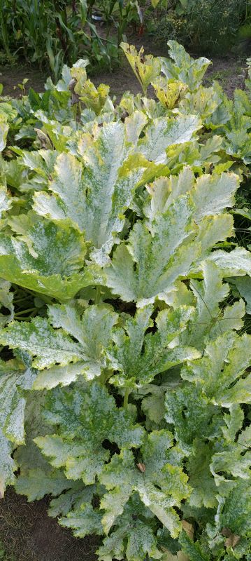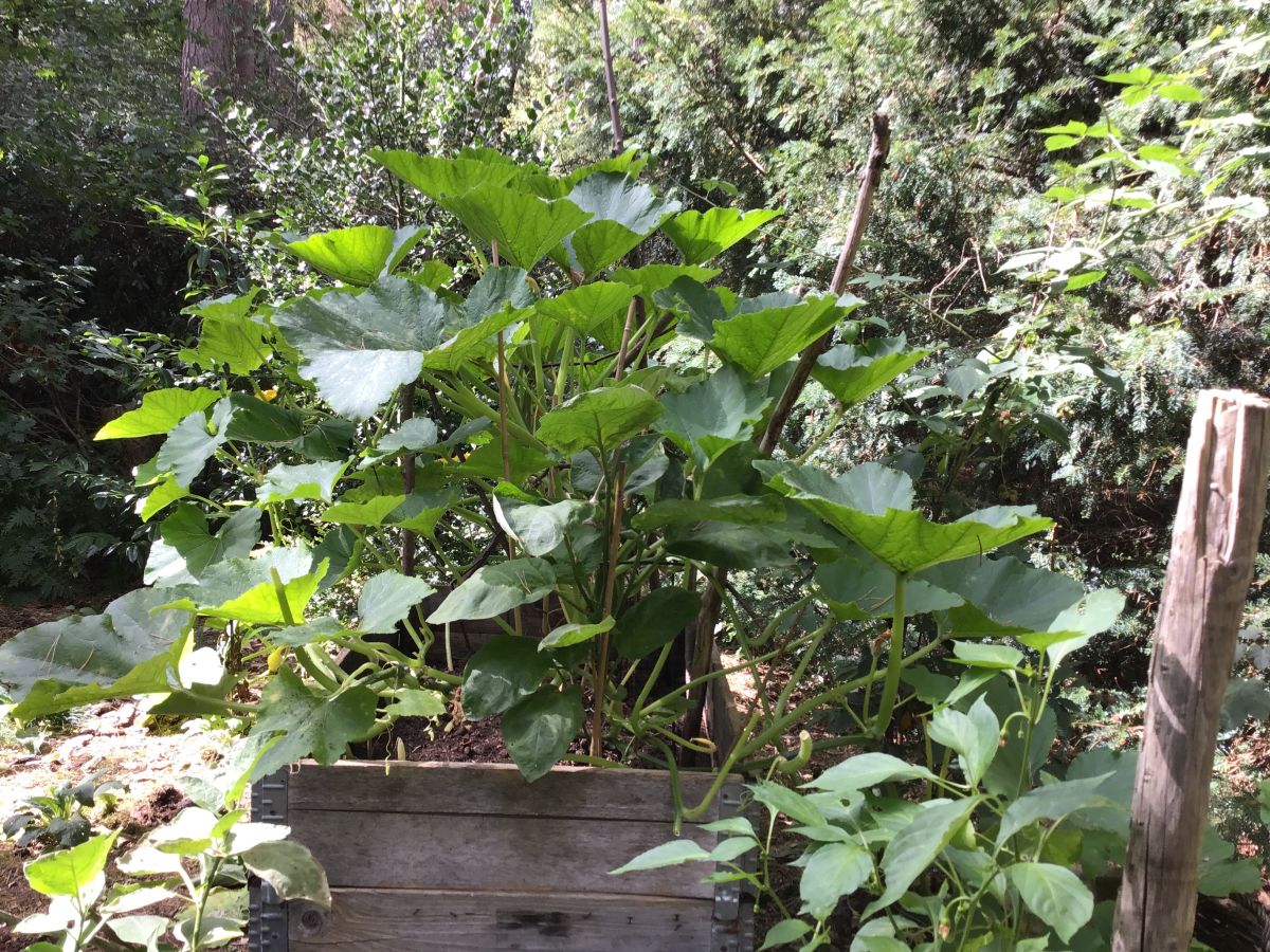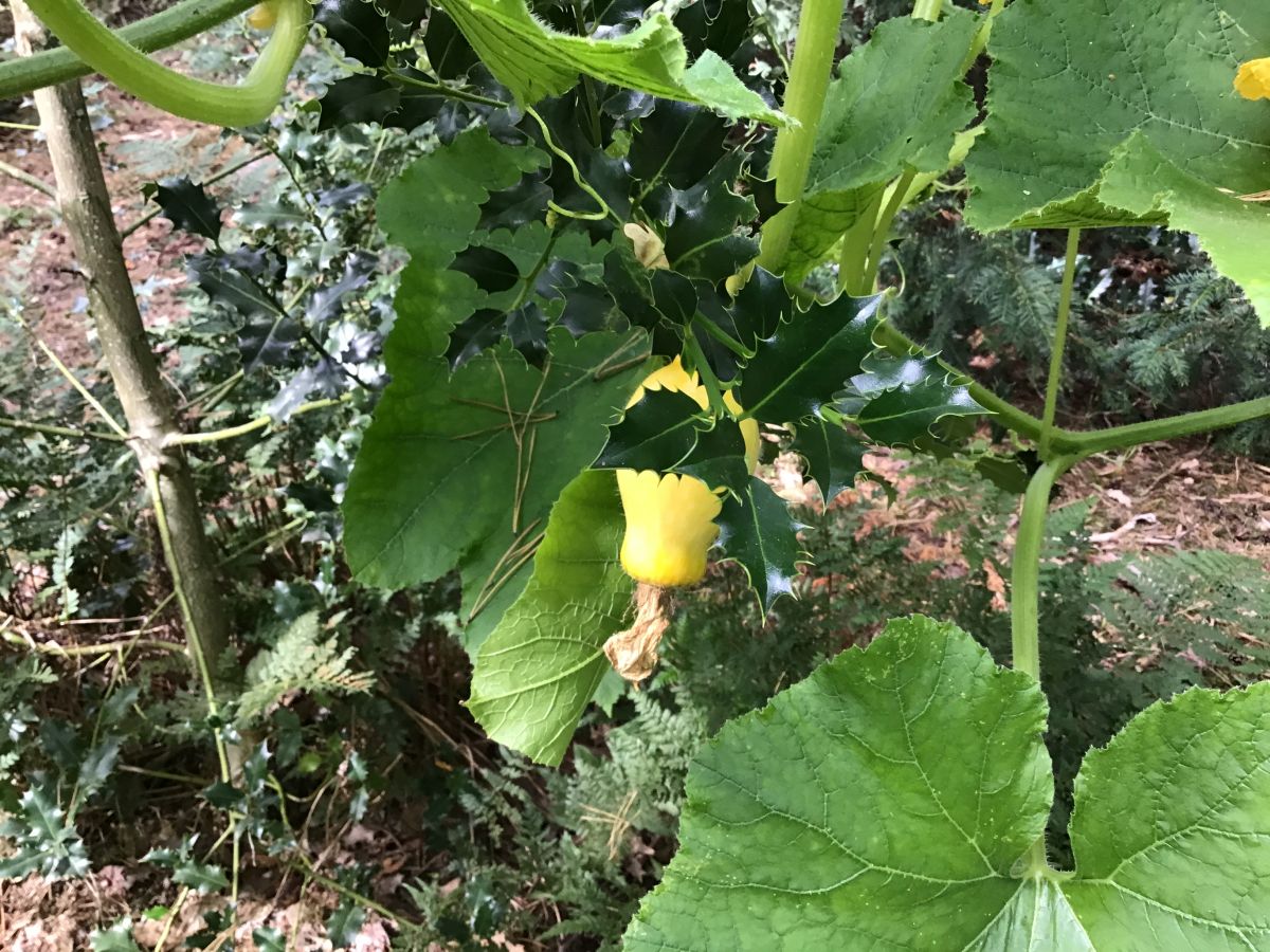 Hier gaat alles best lekker. Thelma Sanders' sweet potato heeft inmiddels een stuk of tien flinke acorn pompoenen hangen. De plant is een beetje aangetast door de meeldauw van de Bianca de Trieste courgette, die ernaast staat, maar ook die blijft op de nieuwe uitlopers nog gewoon courgettes produceren, dus daar maak ik me niet druk over.