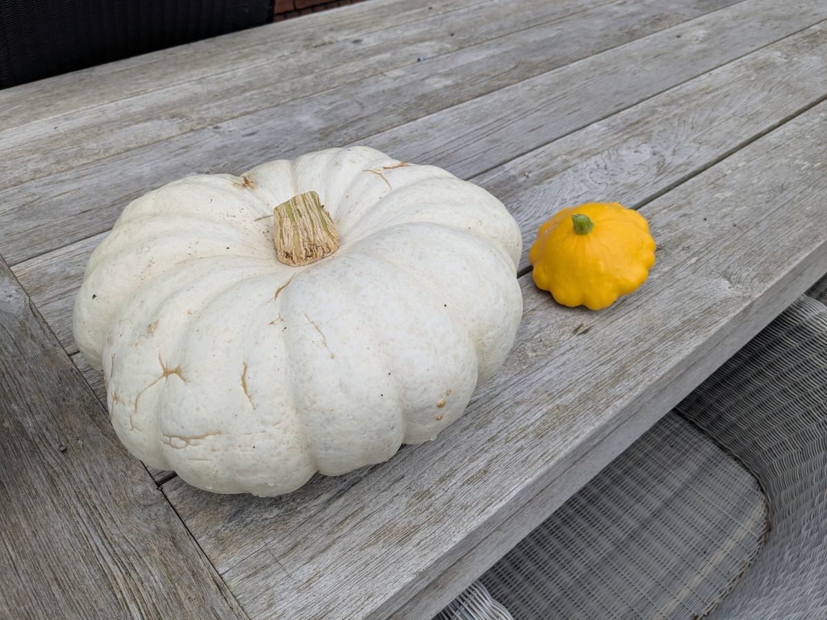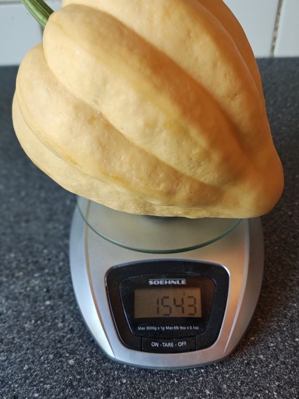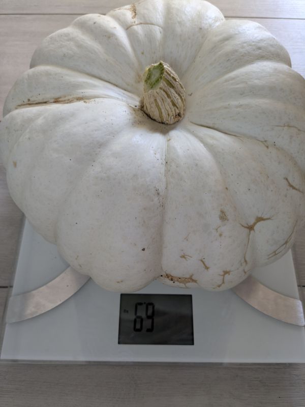De eerste grote flat white boer pompoen geoogst. Mijn keukenweegschaal gaat maar tot 5 kilo, en hij is zwaarder dan dat.