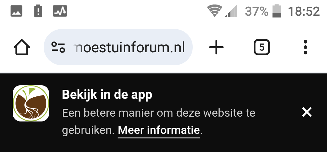 Geplaatst: 5 augustus5 Aug Auteur 22 minuten geleden, henkg zei:Wat ik zie is dat er een shortcut (met MTF icoontje) op een van mijn tabbladen wordt gezet.Heb je hier een voorbeeld van? Ziet dit er er zo uit? Dan is er een snelkoppeling gemaakt naar chrome.De app zou er zo uit moeten zien:Als ik daarop klik, dan zie ik precies hetzelfde als wanneer ik met de browser (Chome) naar www.moestuinforum.nl ga. Niet meer en niet minder.18 uren geleden, rorror zei:Het is een WebApp, dit will zeggen dat deze gebruik maakt van een browser in de achtergrond. Maar draaid als een losse applicatie.Het is niet de bedoeling dat de app de zelfde website toont als in de browser.Bij mij is google chrome b.v. leeg als ik de app heb draaien.Kan je ook een printscreen maken van de app hoe deze er bij jouw uitziet.Welke telefoon gebruik je met welke versie?