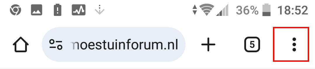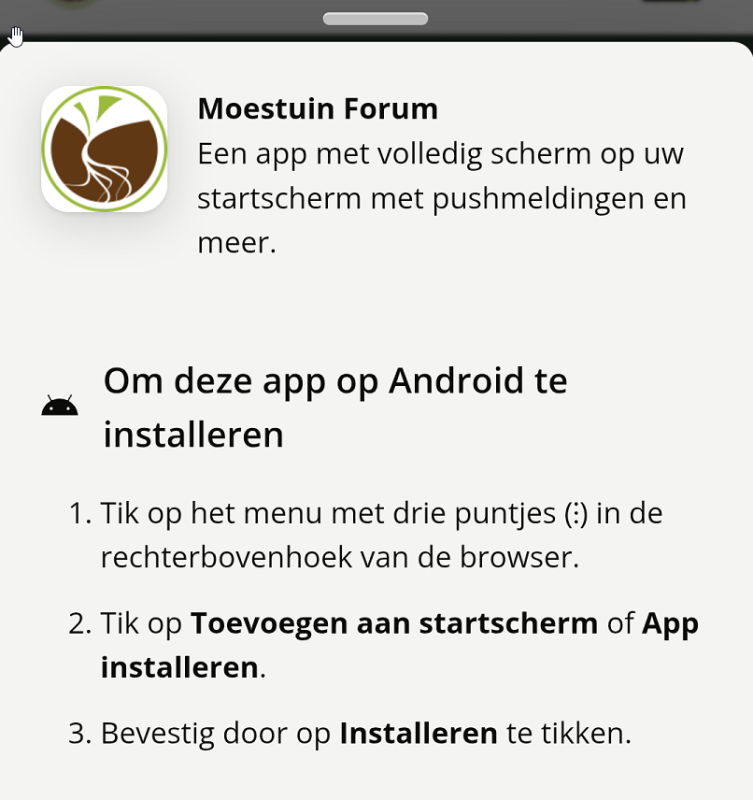 Geplaatst: 31 juli31 Jul Auteur De Moestuin Forum App Installeren op AndroidVoor android toestellen welke software van Android OS versie 8 en hoger draaien.Klik op de melding met meer informatie.Als de melding hebt weggeklikt, dit staat er onder meer Informatie:Klik op de drie puntjes, rood gemarkeerd in de onderstaande afbeelding:Wanneer het dropdown menu te zien is, selecteer "Toevegen aan startscherm"Hierna zie je de volgende melding, kies dan voor de optie "Installeren":Hierna is de volgende melding te zien, kies dan nogmaals voor "Installeren":Na het installeren is de App te vinden onder "Apps". Staat deze niet op de eerste pagina, swipe dan naar links om op de andere pagina's te kijken.Hierna kan je het icoontje toevoegen op het buroblad van je smartphone.Als de app goed geinstalleerd staat, ziet het er als volgt uit:Tijdens het opstarten van de app zie je het welkoms logo:Hierna zal de app op volledige grote starten, je ziet dan geen adress balk meer in de browser.Als de Moestuin Forum App actief is, zie ik een melding "Tik om de URL voor deze app te Kopiëren" in notificatie scherm staan.Aan gezien wij een Webapp gebruiken, wordt in de achtergrond onderdelen van de browser gebruikt.Om deze melding uit te zetten ga je naar Chrome.Druk op de 3 puntjes boven elkaar.Ga naar "Instellingen"Ga naar "Meldingen"Zoek de volgende opties, en zet deze uit.Siteopties op volledig scherm. Hierna zal deze melding niet meer in beeld komen.