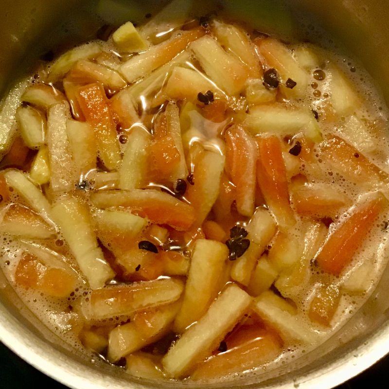 Geplaatst: 19 september19 Sep Staat nu te pruttelen.Ik heb 370 gram schil zonder het groen. In reepjes gesneden.Verwarmen totdat de suiker is gesmolten:200 gram rietsuiker300 gram appelazijn9 geplette pimentbollen2 centimeter gember in plakjes3 kruidnagelen.Schillenstukjes erbij en 15 minuutjes koken. Nacht laten staan, morgen nog eens koken en dan schillen in schone potjes doen, azijn ietwat inkoken en er heet opgieten.Bron: Meloenschil zoetzuur 19 september19 Sep aangepast door appelvrouw We zijn allemaal kinderen van de Aarde 🌎