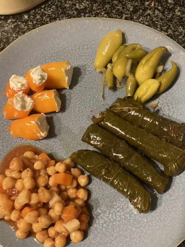 Bovenste twee uet. De ingemaakte olijfkomkommer blijft een succes en ik had ook de ingemaakte habanada’s open gemaakt en gevuld met philadelphia. Echt heerlijk. Ingemaakt met 1 sugar rush stripey en wat cabaca’s. De hele pot heeft daardoor wat extra pit en smaak. De gekochte dolmas en kikkererwten in tomatensaus waren overigens ook heerlijk.