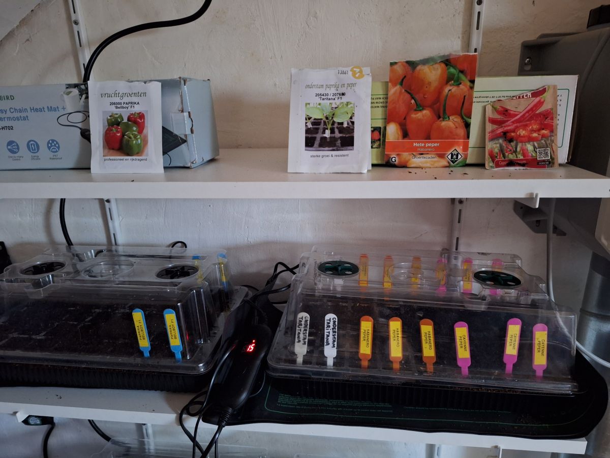 Geplaatst: 30 januari30 Jan 30 januari, zojuist mijn eerste zaadjes gezet : 10 paprikaplantjes, 15 habanero pepers, 15 cayenne peper , en 10 onderstamzaadjes "taritana" voor een poging om te enten.Ik verwacht binnenkort nog een zakje van die gele peper, de madame chunette.Ik heb ze rechtstreeks in de zaai-en stekgrond gezet. De temperatuur op zolder was 15 graden, ik heb de warmtematjes op 23 graden gezet. Als ik straks sprietjes boven de grond zie komen gaan de bijbehorende ledlampjes op de kweekbakjes. Als de helft van de zaadjes opkomt ben ik al blij. Zin in het nieuwe seizoen!